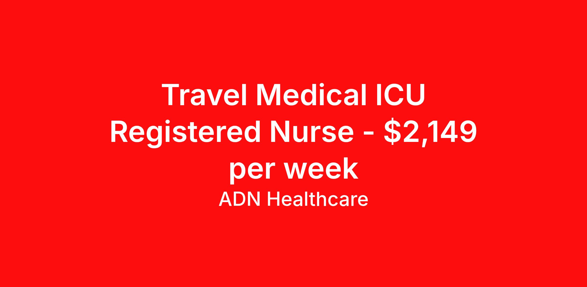 ADN Healthcare is seeking a travel nurse RN ICU - Intensive Care Unit for a travel nursing job in Anderson, Indiana. Job Description & Requirements Specialty: ICU - Intensive Care Unit Discipline: RN Start Date: 04/05/2026 Duration: 13 weeks 36 hours per week Shift: 12 hours, nights Employment Type: Travel Weekly rate listed is an estimate and can vary based on the applicant's home location, VMS Fees, and onboarding costs. Our Client is currently seeking ICU - Intensive Care Unit for positions in Anderson, Indiana for a 3x12 Nights, 19:00:00-07:00:00, 12.00-3 shift. The ideal candidate will possess a current Indiana license. This is a RN position in the Intensive Care Unit 001 (14500). You must have a Nursing License and at least 2 years of recent experience as a RN – ICU - Intensive Care Unit. Requirements • Current Resume • Nursing License per state • Current BLS and/or ACLS and/or Specialty Certifications • 2 current clinical references • Competitive pay rates • Health/Dental Benefit package • License reimbursement • Refer a friend and earn extra cash! ADN Healthcare Job ID 35909731. Pay package is based on 12 hour shifts and 36.0 hours per week (subject to confirmation) with tax-free stipend amount to be determined. Posted job title: RN:ICU - Intensive Care Unit,19:00:00-07:00:00 About ADN Healthcare ADN Healthcare has thousands of contract and direct hire positions available. We offer medical, dental, and vision coverage. Benefits Guaranteed Hours Continuing Education Company provided housing options Mileage reimbursement Referral bonus Medical benefits Dental benefits Vision benefits License and certification reimbursement Weekly pay Life insurance Health Care FSA