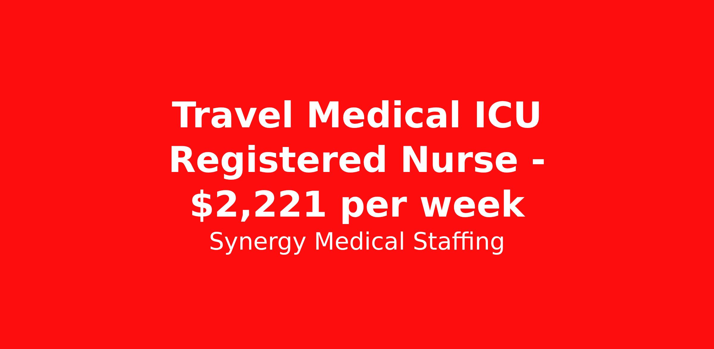 Synergy Medical Staffing is seeking a travel nurse RN ICU - Intensive Care Unit for a travel nursing job in Salem, Massachusetts. Job Description & Requirements Specialty: ICU - Intensive Care Unit Discipline: RN Start Date: 05/31/2026 Duration: 13 weeks 36 hours per week Shift: 12 hours, nights Employment Type: Travel Travel, RN - ICU Location: Salem, Massachusetts Shift: 3X12 Nights, 19:00:00-07:00:00, 12.00-3 Duration 13 Weeks When you join Synergy Medical Staffing, you’ll have a dedicated recruiter helping you at all times. Your recruiter is a cross between a career coach and a concierge. They will help you fine-tune your resume, find your next job, and locate an apartment (even one that takes pets!). Make one call and get help with everything from placement to housing to payroll, even travel directions! As a travel, contract and permanent placement medical staffing company with over 20 years of experience in the industry, we understand your needs. Synergy’s Benefits are best in class and include the following: 401K that matches up to 5% of your pay and you are 100% vested from Day 1. Medical, Dental, Vision, Life insurance, Long and short-term disability and others Loyality Program Weekly pay Holiday Pay (varies by Assignment) Guaranteed Hours (varies by Assignment) Referral bonus Continuing Education License and certification reimbursement Synergy Medical Staffing Job ID 36155735. Pay package is based on 12 hour shifts and 36.0 hours per week (subject to confirmation) with tax-free stipend amount to be determined. Posted job title: RN:ICU,19:00:00-07:00:00 About Synergy Medical Staffing When you join Synergy Medical Staffing, you’ll have a dedicated recruiter helping you at all times. Your recruiter is a cross between a career coach and a concierge. They will help you fine-tune your resume, find your next job, and locate an apartment (even one that takes pets!). Make one call and get help with everything from placement to housing to payroll, even travel directions! As a travel, contract and permanent placement medical staffing company with over 12 years of experience in the industry, we understand your needs. Are you interested in traveling, or just a job around the corner? Whatever your preference, you can be sure there are plenty of Nursing Jobs, Allied Jobs and Physical Therapy Jobs, Occupational Therapy Jobs, Speech Therapy Jobs and Rehab Therapy jobs anywhere you want to go. Synergy Medical Staffing professionals have been in the Medical staffing employment and staffing industry for over 12 years, and have developed solid relationships with numerous healthcare facilities nationwide. Contact us now and expand your medical career with new opportunities from Synergy Medical Staffing. Synergy’s Benefits are best in class and include the following 401K Day 1 Full Medical, Dental, Vision, Life insurance, Long and short term disability and others Student Loan Repayment and CEU reimbursement Loyalty bonus after 600 hours Benefits Discount program Weekly pay Holiday Pay Guaranteed Hours Referral bonus Medical benefits Dental benefits Continuing Education License and certification reimbursement Life insurance 401k retirement plan Cancelation protection Vision benefits