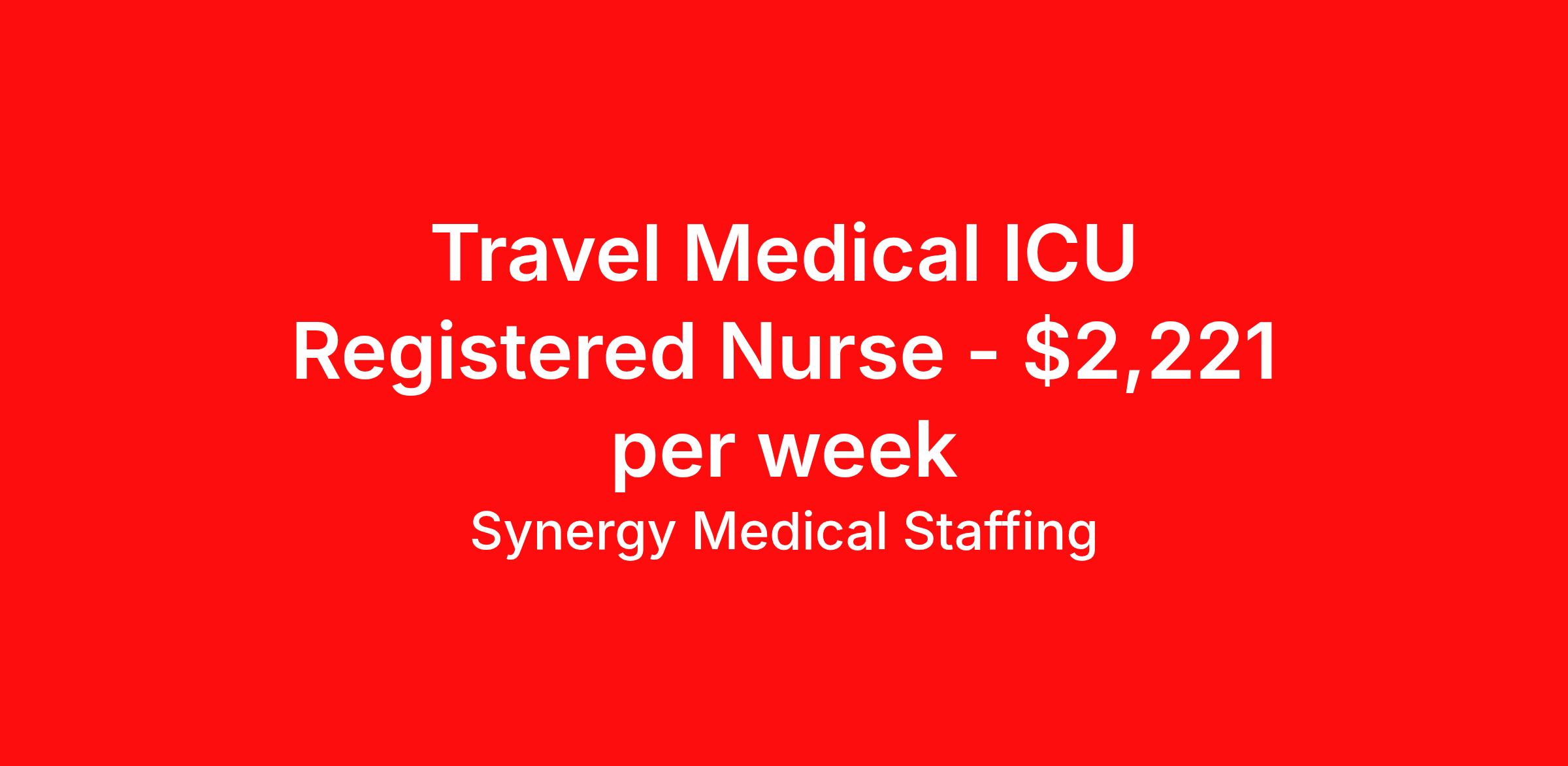 Synergy Medical Staffing is seeking a travel nurse RN ICU - Intensive Care Unit for a travel nursing job in Salem, Massachusetts. Job Description & Requirements Specialty: ICU - Intensive Care Unit Discipline: RN Start Date: 05/31/2026 Duration: 13 weeks 36 hours per week Shift: 12 hours, nights Employment Type: Travel Travel, RN - ICU Location: Salem, Massachusetts Shift: 3X12 Nights, 19:00:00-07:00:00, 12.00-3 Duration 13 Weeks When you join Synergy Medical Staffing, you’ll have a dedicated recruiter helping you at all times. Your recruiter is a cross between a career coach and a concierge. They will help you fine-tune your resume, find your next job, and locate an apartment (even one that takes pets!). Make one call and get help with everything from placement to housing to payroll, even travel directions! As a travel, contract and permanent placement medical staffing company with over 20 years of experience in the industry, we understand your needs. Synergy’s Benefits are best in class and include the following: 401K that matches up to 5% of your pay and you are 100% vested from Day 1. Medical, Dental, Vision, Life insurance, Long and short-term disability and others Loyality Program Weekly pay Holiday Pay (varies by Assignment) Guaranteed Hours (varies by Assignment) Referral bonus Continuing Education License and certification reimbursement Synergy Medical Staffing Job ID 36155735. Pay package is based on 12 hour shifts and 36.0 hours per week (subject to confirmation) with tax-free stipend amount to be determined. Posted job title: RN:ICU,19:00:00-07:00:00 About Synergy Medical Staffing When you join Synergy Medical Staffing, you’ll have a dedicated recruiter helping you at all times. Your recruiter is a cross between a career coach and a concierge. They will help you fine-tune your resume, find your next job, and locate an apartment (even one that takes pets!). Make one call and get help with everything from placement to housing to payroll, even travel directions! As a travel, contract and permanent placement medical staffing company with over 12 years of experience in the industry, we understand your needs. Are you interested in traveling, or just a job around the corner? Whatever your preference, you can be sure there are plenty of Nursing Jobs, Allied Jobs and Physical Therapy Jobs, Occupational Therapy Jobs, Speech Therapy Jobs and Rehab Therapy jobs anywhere you want to go. Synergy Medical Staffing professionals have been in the Medical staffing employment and staffing industry for over 12 years, and have developed solid relationships with numerous healthcare facilities nationwide. Contact us now and expand your medical career with new opportunities from Synergy Medical Staffing. Synergy’s Benefits are best in class and include the following 401K Day 1 Full Medical, Dental, Vision, Life insurance, Long and short term disability and others Student Loan Repayment and CEU reimbursement Loyalty bonus after 600 hours Benefits Discount program Weekly pay Holiday Pay Guaranteed Hours Referral bonus Medical benefits Dental benefits Continuing Education License and certification reimbursement Life insurance 401k retirement plan Cancelation protection Vision benefits
