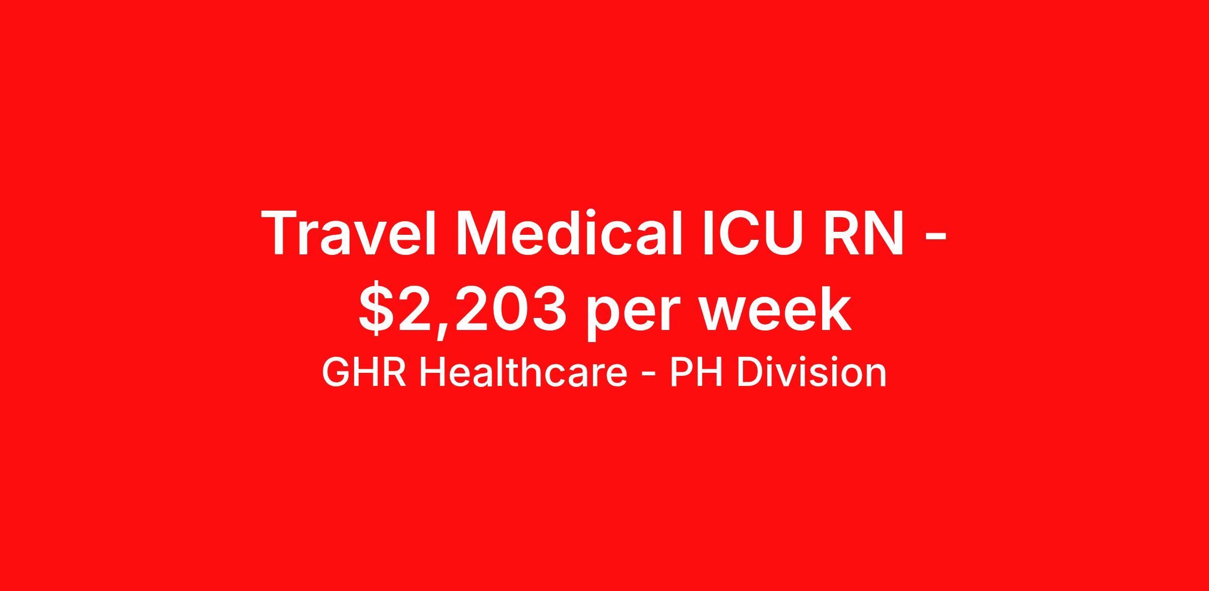 GHR Healthcare - PH Division is seeking a travel nurse RN ICU - Intensive Care Unit for a travel nursing job in Salem, Massachusetts. Job Description & Requirements Specialty: ICU - Intensive Care Unit Discipline: RN Start Date: 04/19/2026 Duration: 12 weeks 36 hours per week Shift: 12 hours Employment Type: Travel Planet Healthcare Job ID 76283581. Pay package is based on 12 hour shifts and 36 hours per week (subject to confirmation) with tax-free stipend amount to be determined. About GHR Healthcare - PH Division For over 30 years, GHR Healthcare has been the bridge between healthcare professionals and the facilities that need them nationwide. We're committed to uncovering your ideal fit, supported by GHR's dedication to competitive compensation, transparent communication, and a devoted team that genuinely cares about your career journey. You can trust us to stand by your side as your advocate, confidante, and partner in advancing your career. At GHR, care and consideration are at the heart of everything we do. Visit ghrhealthcare.com to learn more.