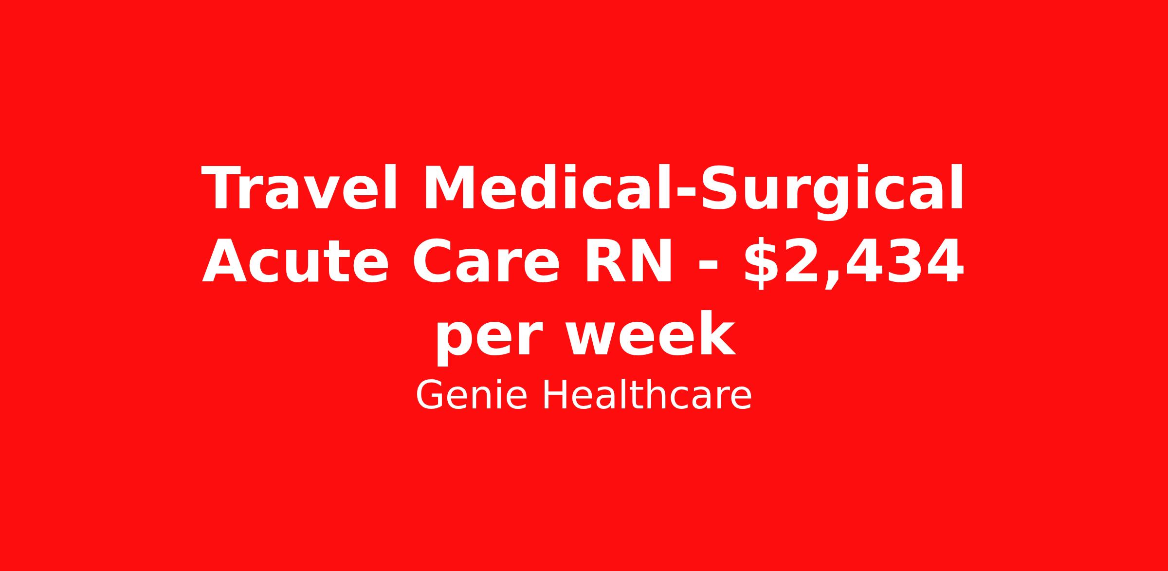 Genie Healthcare is seeking a travel nurse RN Med Surg for a travel nursing job in Peoria, Illinois. Job Description & Requirements Specialty: Med Surg Discipline: RN Start Date: 03/30/2026 Duration: 13 weeks 36 hours per week Shift: 12 hours, nights Employment Type: Travel Genie Healthcare is looking for a RN to work in MedSurg for a 13 weeks travel assignment located in Peoria, IL for the Shift (3x12 nights, 19:00:00-07:00:00, 12.00-3). Pay and benefits packages are estimated based on client bill rate at time the job was posted. These rates are subject to change. Exact pay and benefits vary based on several things, including, but not limited to, guaranteed hours, client changes in bill rate, experience, etc. Benefits: Medical Insurance, Dental Insurance, Vision Insurance, 401(k) with company matching (50% up to 6% of what you contribute) Genie Healthcare Job ID 17973379. Pay package is based on 12 hour shifts and 36.0 hours per week (subject to confirmation) with tax-free stipend amount to be determined. Posted job title: RN:MedSurg,19:00:00-07:00:00 About Genie Healthcare Genie Healthcare is one of the fastest growing Nurse Travel Agencies in the USA. Genie serves hundreds of facilities and has over 4000 current travel RN contracts open at any given time. Genie provides travel RN’s flexibility, support, top pay scale, housing and the 1 rated, multi-state health insurance coverage. Genie Healthcare carries with it a commitment to providing a comprehensive level of service and quality care. Growing from a small team of eager recruiters to a company with satisfied clients in nearly every corner of the nation, delivering excellence in patient and customer care is the key to Genie’s success. The management team has 20 years of experience in workforce solutions and staffing in medical and non-medical fields, roles ranging from Clerical job to Cardiologist to software developer to CEO.