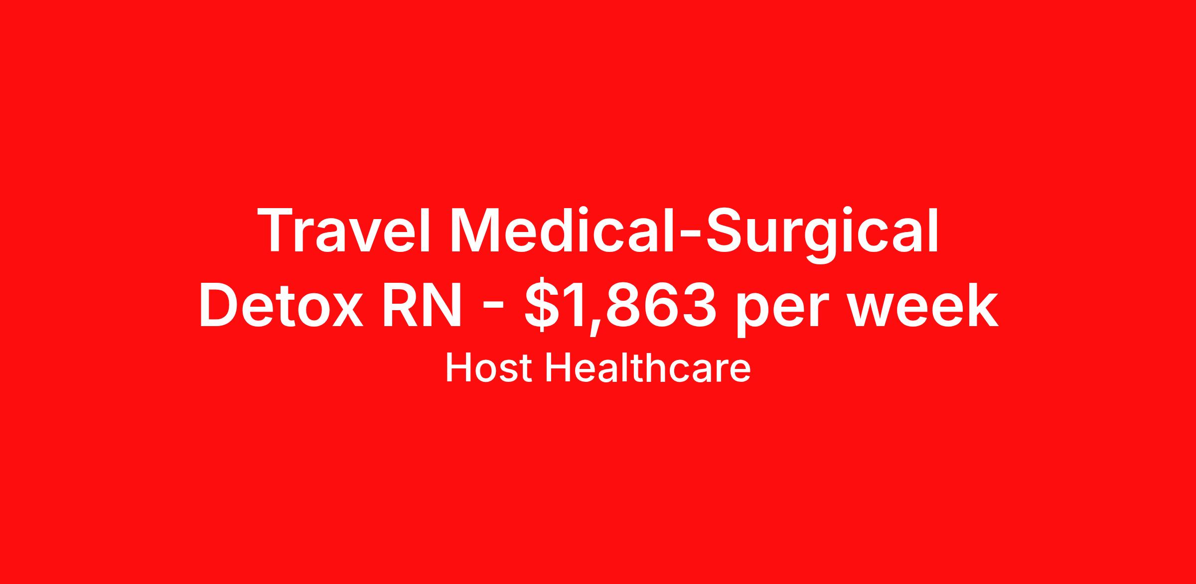 Host Healthcare is seeking a travel nurse RN Med Surg for a travel nursing job in Pulaski, Tennessee. Job Description & Requirements Specialty: Med Surg Discipline: RN Start Date: 03/30/2026 Duration: 13 weeks 36 hours per week Shift: 12 hours, nights Employment Type: Travel Host Healthcare Job ID a1fVX000002ygjBYAQ. Pay package is based on 12 hour shifts and 36 hours per week (subject to confirmation) with tax-free stipend amount to be determined. Posted job title: RN - Detox/ ER Exp Considered About Host Healthcare At Host Healthcare, we provide a truly comfortable experience as you explore your travel nursing, therapy, or allied career. We make your travel healthcare journey easy by taking care of all the details, so you don’t have to. We are on a mission to help others live better and we do this by helping the healers of the world be as comfortable as possible. With access to tens of thousands of travel nursing, therapy, and allied jobs in all 50 states, our responsive and friendly recruiters find your dream position based on what’s important to you. During your assignment, get access to premium benefits, including Day 1 medical that continues up to 30 days between assignments, 401K matching, travel reimbursements, dedicated housing support, and more. We also offer 24/7 support from our team and access to our on-staff clinicians so you can feel comfortable and confident throughout your entire assignment. Travel comfortably with Host Healthcare. Benefits Referral bonus School loan reimbursement Vision benefits Wellness and fitness programs Company provided housing options License and certification reimbursement Life insurance Medical benefits Mileage reimbursement Pet insurance Discount program Employee assistance programs Guaranteed Hours Health savings account Holiday Pay 401k retirement plan Continuing Education Dental benefits