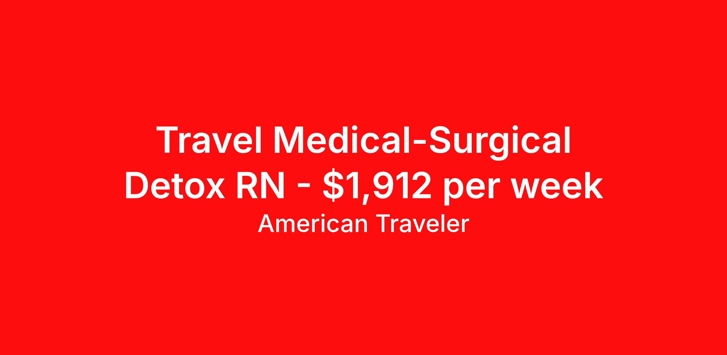American Traveler is seeking a travel nurse RN Med Surg for a travel nursing job in Pulaski, Tennessee. Job Description & Requirements Specialty: Med Surg Discipline: RN Start Date: 03/30/2026 Duration: 13 weeks 36 hours per week Shift: 12 hours, nights Employment Type: Travel Assignment Overview Shift: Nights, 3x12hrs Hours: 36 hrs/wk Start Date: Mar 30, 2026 Length: 13 weeks Openings: 1 Description American Traveler is seeking a travel RN for a Detox Unit night shift position in Pulaski, TN, requiring at least 3 years of experience and AHA-certified BLS, ALS, and PALS. Details 13-week contract at an acute care hospital in Pulaski, TN Detox Unit assignment; ER experience will also be considered 13-bed unit serving adult and geriatric patients (ages 17) with substance abuse, polysubstance abuse, ETOH withdrawal, seizures, liver disease, hypertension, high fall risk, and related behavioral and medical conditions Patient ratio of 1:7 Night shift: 7:00 PM – 7:00 AM 36 hours per week Every other weekend required, plus additional weekends as needed No on-call requirements Floating to other departments may be required on an as-needed basis, but is not standard Equipment used includes IV pumps, Zoll monitors, and IV catheters EMR: HMS/Medhost Requirements Active RN license valid in Tennessee (TN state license or compact license) required ASN minimum required education Current AHA certifications required prior to start: BLS, ACLS, and PALS Minimum 3 years of RN experience required; 5 years preferred Proficiency in patient care across all age groups and bedside shift reporting IV access skills required CIWA/COWS experience preferred Experience assisting with bedside procedures such as PICC lines and midlines preferred Social Security number and date of birth required for consideration Must reside more than 60 miles from the facility to be eligible for travel pay rates Candidates must not have worked as permanent staff at any LifePoint facility within the last 12 months Must not be employed full-time elsewhere Additional Information Care responsibilities include administering valium tapers, Subutex, Vivitrol, banana bags, rescue medications, and routine/home medications for detox and substance abuse patients Handle With Care certification will be required after hire All clinical staff must be cleared through the Tennessee Abuse Registry prior to assignment start AHA-issued certifications are required (non-AHA equivalents not accepted) Orientation is held weekly on Mondays Education expectations and required audits/processes — including bedside shift report, briefs, debriefs, and unit checks — are expected to be completed and followed throughout the contract Scrub color: any solid color; hoodies, open-toed shoes, logo outerwear, and jewelry or items that could pose a safety risk are not permitted Ideal candidates are team-oriented, calm under pressure, confident in clinical judgment, and willing to support and improve department processes American Traveler Job ID P-685516. Pay package is based on 12 hour shifts and 36 hours per week (subject to confirmation) with tax-free stipend amount to be determined. Posted job title: Travel RN - Med/Surg About American Traveler With over 25 years of experience, American Traveler has established a reputation for outstanding customer service. Our team ensures a smooth, worry-free experience for those starting on or expanding their travel nursing and allied careers. With thousands of travel nursing and allied jobs nationwide, our attentive and approachable recruiters find positions that align perfectly with your career aspirations and personal requirements. American Traveler offers exceptional benefits, including premium medical, dental, vision and life insurance beginning day one of your assignment, generous 401(k) match, substantial housing stipends, and more. Additionally, with 24/7 support and access to our in-house clinicians, you are assured confidence and comfort throughout your assignment. With our team behind you, you can relax and enjoy a rewarding travel career.