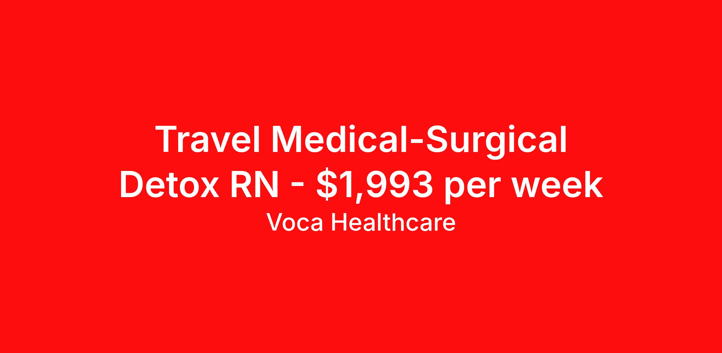 Voca Healthcare is seeking a travel nurse RN Med Surg for a travel nursing job in Pulaski, Tennessee. Job Description & Requirements Specialty: Med Surg Discipline: RN Start Date: 03/30/2026 Duration: 13 weeks 36 hours per week Shift: 12 hours, nights Employment Type: Travel Benefits available on 1st of the month after start: Holiday pay Weekly pay Retention bonus 401k retirement plan Medical benefits Dental benefits Vision benefits Referral bonus Are you an experienced Med Surg RN looking for your next exciting travel assignment, or are you ready to start your travel healthcare career? At Voca, we offer an unmatched experience for healthcare professionals with a travel-first culture that prioritizes your needs and supports your career growth. We understand that every traveler is unique, which is why we provide personalized support from our experienced team of recruiters who are dedicated to matching you with the right assignments. Join Voca today, where you will enjoy a rewarding career and a full suite of benefits designed to ensure your success and well-being. As a Med Surg RN with Voca, you’ll have the opportunity to work in dynamic healthcare settings, gaining valuable experience while receiving competitive compensation and support every step of the way. Qualifications : -Minimum of 2 years of recent experience as a Med Surg RN is preferred, but we are open to exceptional candidates with a strong passion. -Valid certification and/or licensure in the state of practice, if applicable. -Demonstrated ability to maintain a high level of professionalism and composure, especially during stressful and fast-paced moments in the healthcare setting. -Valid Driver’s License and the ability to travel between assignment locations. -Ability to pass a background check and drug screen to meet healthcare industry standards. Why Choose Voca? -Comprehensive Benefits Package: We offer Health, Dental, and Vision Insurance to ensure that you and your loved ones are well taken care of. -Life and Disability Insurance for added peace of mind. -401(k) options to help you save for your future with employer matching. -Certification and Licensure Reimbursement to support your professional development. -Generous Referral Bonus Program – earn rewards for referring your qualified peers to join the Voca team. -Weekly Direct Deposit ensures timely access to your earnings. At Voca, You Are Our Priority : -Travel-First Culture: We understand that travel assignments offer unique challenges, so we ensure a flexible and supportive work environment that focuses on your success. -Personalized Support: Work with a dedicated recruiter who will be your advocate throughout your journey, helping you navigate each assignment and providing personalized guidance to ensure your goals are met. -Strong Relationships: Voca’s culture fosters long-term relationships with our travelers. -We care about your career, your needs, and your future. Whether you're a seasoned Med Surg RN or ready to take the next step in your travel healthcare career, Voca is the perfect place for you to grow, learn, and thrive. Apply today to connect with one of our talented recruiters and begin your next adventure! Apply Now to get started on your next travel assignment with Voca – where your career and well-being come first! Voca Healthcare Job ID 17981150. Pay package is based on 12 hour shifts and 36.0 hours per week (subject to confirmation) with tax-free stipend amount to be determined. Posted job title: RN:Med Surg,19:00:00-07:00:00 About Voca Healthcare As a Voca Traveler, you will gain new clinical skills, visit amazing places and meet awesome healthcare professionals. As a travel health professional, your experience and dedication to patient care is in high demand throughout the United States. Whether you are a veteran traveler looking for your next opportunity, or you are looking to travel for the first time, Voca is here to support you. Voca’s experienced and dedicated travel team works in concert with you every step of the way. Our long-standing partnerships with some of the most respected and recognized healthcare organizations in the country allow us to identify career opportunities to help you increase your knowledge and experience while working with some of the best physicians and healthcare professionals in the world. At Voca, we strongly believe a better career results in a happier you. We are here to help you find a position that is professionally and personally rewarding. Benefits Holiday Pay 401k retirement plan Medical benefits Dental benefits Vision benefits Guaranteed Hours