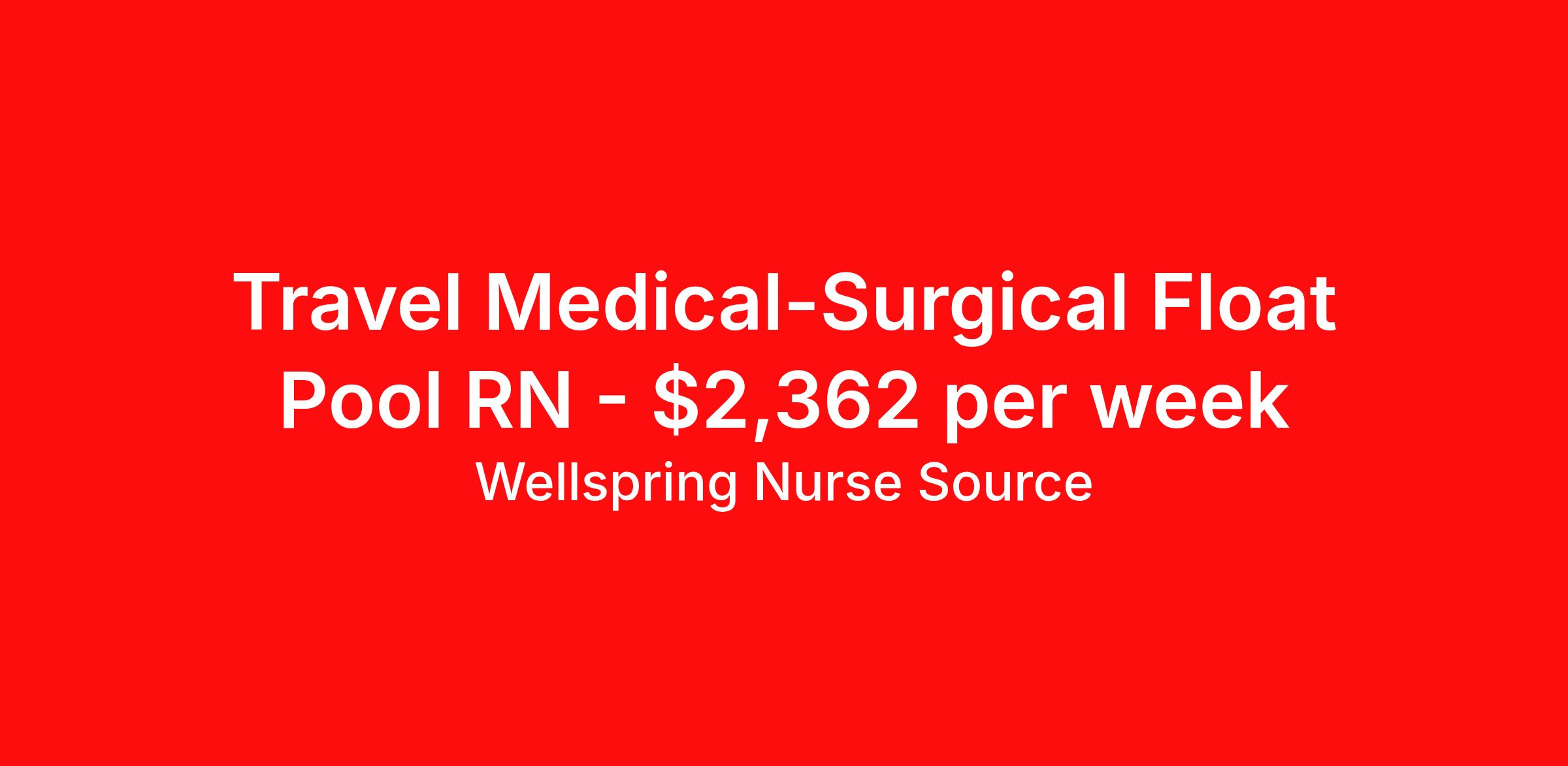 Wellspring Nurse Source is seeking a travel nurse RN Float Med Surg for a travel nursing job in Albany, Georgia. Job Description & Requirements Specialty: Med Surg Discipline: RN Start Date: ASAP Duration: 13 weeks 36 hours per week Shift: 12 hours, days Employment Type: Travel Wellspring Nurse Source Job ID 35805125. Pay package is based on 12 hour shifts and 36.0 hours per week (subject to confirmation) with tax-free stipend amount to be determined. Posted job title: RN Float About Wellspring Nurse Source Wellspring is nurse owned and operated which means that we get you, we stand behind you, and we advocate for you. We are 100% committed to helping you find your best job at the best rate. We are unwavering in our commitment to supporting our clinicians on every step of their travel adventure, assisting with everything from onboarding and payroll to on-the-job clinical support with a dedicated Clinician Success Team. You’re not just a number at Wellspring, you’re a valued member of our family. Join us and experience the Wellspring difference.