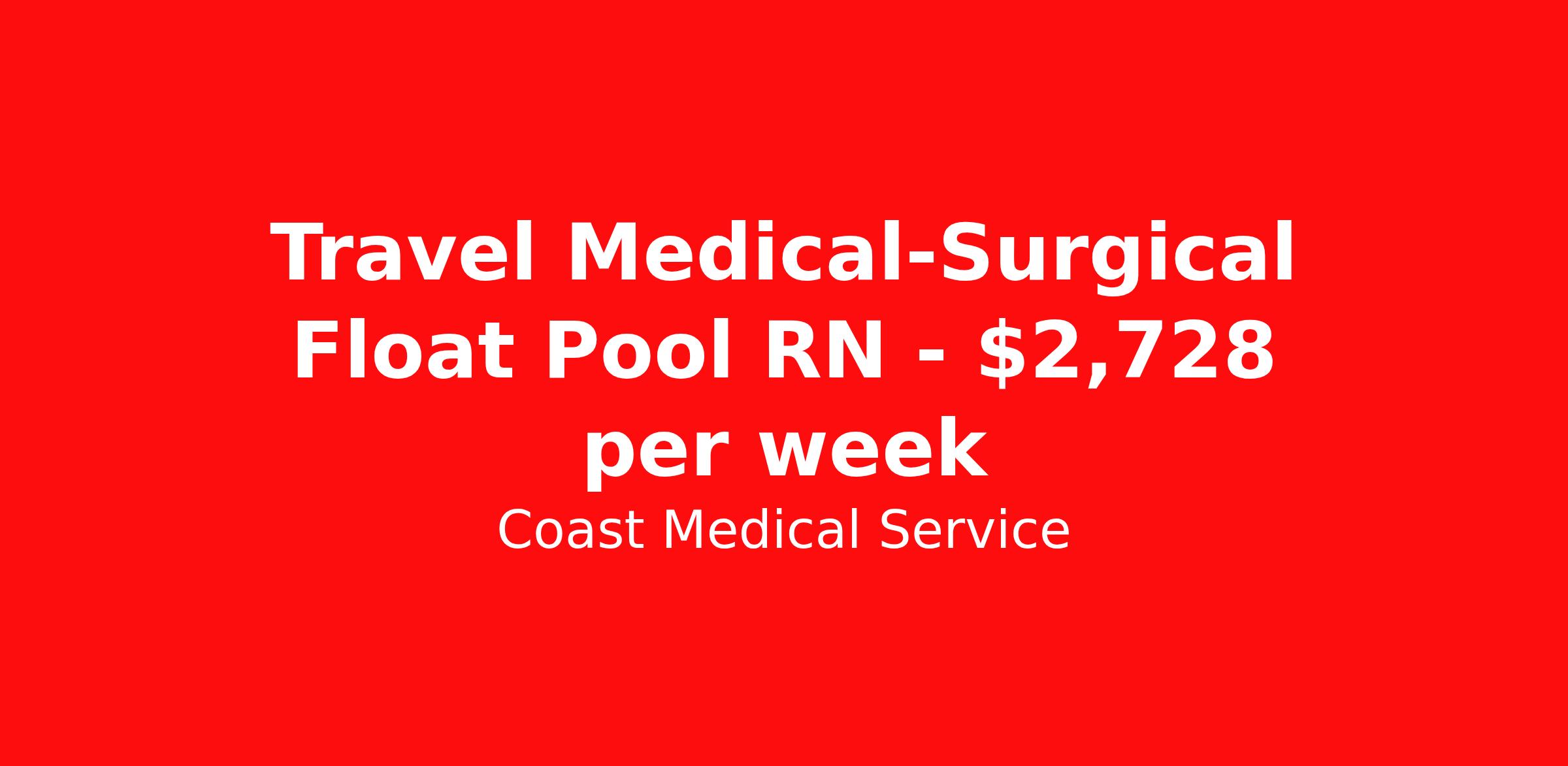 Coast Medical Service is seeking a travel nurse RN Med Surg for a travel nursing job in Albany, Georgia. Job Description & Requirements Specialty: Med Surg Discipline: RN Start Date: 04/13/2026 Duration: 13 weeks 48 hours per week Shift: 12 hours, days Employment Type: Travel Coast Medical Service is a nationwide travel nursing & allied healthcare staffing agency dedicated to providing an elite traveler experience for the experienced or first-time traveler. Coast is featured on Blue Pipes' 2023 Best Travel Agencies and named a 2022 Top Rated Healthcare Staffing Firm & 2023 First Half Top Rated Healthcare Staffing Firm by Great Recruiters. Please note that pay rate may differ for locally based candidates. Please apply here or contact a recruiter directly to learn more about this position & the facility, and/or explore others that may be of interest to you. We look forward to speaking with you! Coast Medical Services Job ID 35803990. Pay package is based on 12 hour shifts and 48.0 hours per week (subject to confirmation) with tax-free stipend amount to be determined. Posted job title: RN:Medical-Surgical,07:00:00-19:30:00