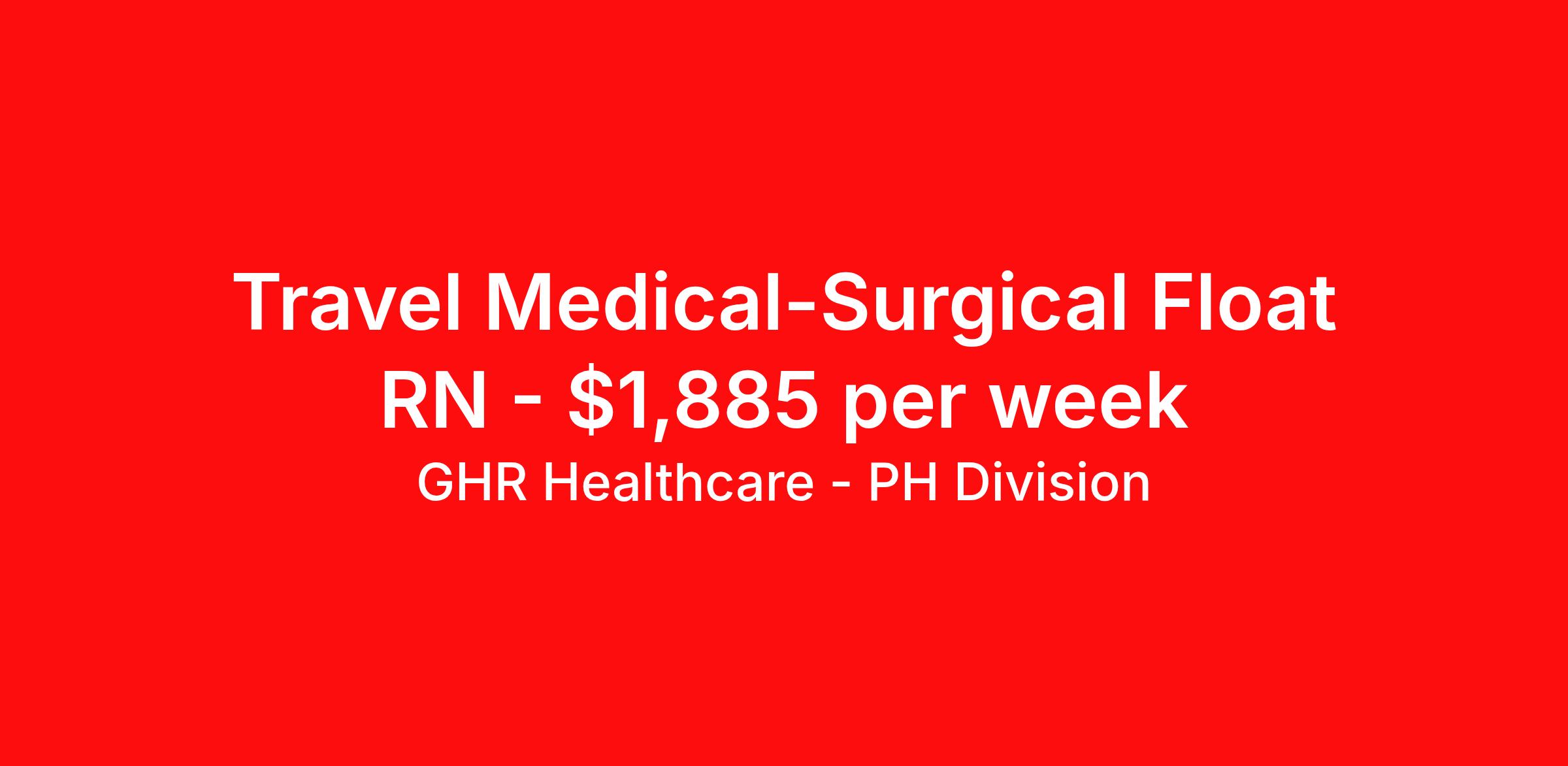 GHR Healthcare - PH Division is seeking a travel nurse RN Float Med Surg for a travel nursing job in Huntington, West Virginia. Job Description & Requirements Specialty: Med Surg Discipline: RN Start Date: 04/13/2026 Duration: 13 weeks 36 hours per week Shift: 12 hours Employment Type: Travel Planet Healthcare Job ID 76428059. Pay package is based on 12 hour shifts and 36 hours per week (subject to confirmation) with tax-free stipend amount to be determined. About GHR Healthcare - PH Division For over 30 years, GHR Healthcare has been the bridge between healthcare professionals and the facilities that need them nationwide. We're committed to uncovering your ideal fit, supported by GHR's dedication to competitive compensation, transparent communication, and a devoted team that genuinely cares about your career journey. You can trust us to stand by your side as your advocate, confidante, and partner in advancing your career. At GHR, care and consideration are at the heart of everything we do. Visit ghrhealthcare.com to learn more.