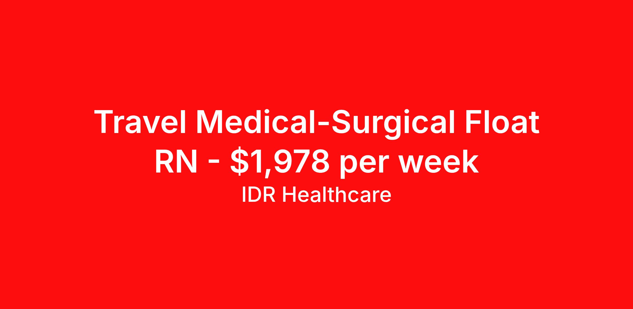 IDR Healthcare is seeking a travel nurse RN Float Med Surg for a travel nursing job in Huntington, West Virginia. Job Description & Requirements Specialty: Med Surg Discipline: RN Start Date: 04/13/2026 Duration: 13 weeks 36 hours per week Shift: 12 hours, nights Employment Type: Travel IDR Healthcare is an awarding winning staffing firm that believes it is a privilege and awesome responsibility to serve those who selflessly care for others. Our mission is to empower healthcare professionals to achieve their fullest potential both personally and professionally while they create positive change within the healthcare community. We exercise true grit, tenacity, and authenticity while embracing and ownership mindset to go above and beyond providing healthcare professionals a world class experience. We are employee owned and our travelers and clinicians earn shares/equity by just completing multiple assignments! We have been named SIA’s Fastest Growing Staffing Firms and have won ClearlyRated® Best of Staffing for 11 consecutive years! This cements our commitment to clinician satisfaction earning top net promoter scores putting us in the top 2% of agencies in North America! TravelFarWithIDR and see what an extraordinary experience is all about! Benefits 2024 World Staffing Best Staffing Firms to Work For! ESOP (Equity) Healthcare Benefits for up to 30 days Between Assignments Comprehensive Health Insurance Dental and Vision Insurance Sign-On, Completion, & Referral Bonus Programs License and Certification Reimbursement Weekly Pay and Competitive Compensation Large Network of Clients and Job Opportunities 401k retirement plan Exclusive Assignments IDR Job ID 495804. Pay package is based on 12 hour shifts and 36 hours per week (subject to confirmation) with tax-free stipend amount to be determined. About IDR Healthcare IDR Healthcare is an awarding winning staffing firm that believes it is a privilege and awesome responsibility to serve those who selflessly care for others. Our mission is to empower healthcare professionals to achieve their fullest potential both personally and professionally while they create positive change within the healthcare community. We exercise true grit, tenacity, and authenticity while embracing and ownership mindset to go above and beyond providing healthcare professionals a world class experience. We are employee owned and our travelers and clinicians earn shares/equity by just completing multiple assignments! We have been named SIA’s Fastest Growing Staffing Firms and have won ClearlyRated® Best of Staffing for 11 consecutive years! This cements our commitment to clinician satisfaction earning top net promoter scores putting us in the top 2% of agencies in North America! Help us give back! For every booked assignment, proceeds are donated to St. Jude and Feeding America! Last year we raised over $18,000 for St. Jude and provided over 49,000 meals for children in need. TravelFarWithIDR and see what it is all about! Benefits Weekly pay 401k retirement plan Referral bonus Medical benefits Dental benefits License and certification reimbursement Vision benefits