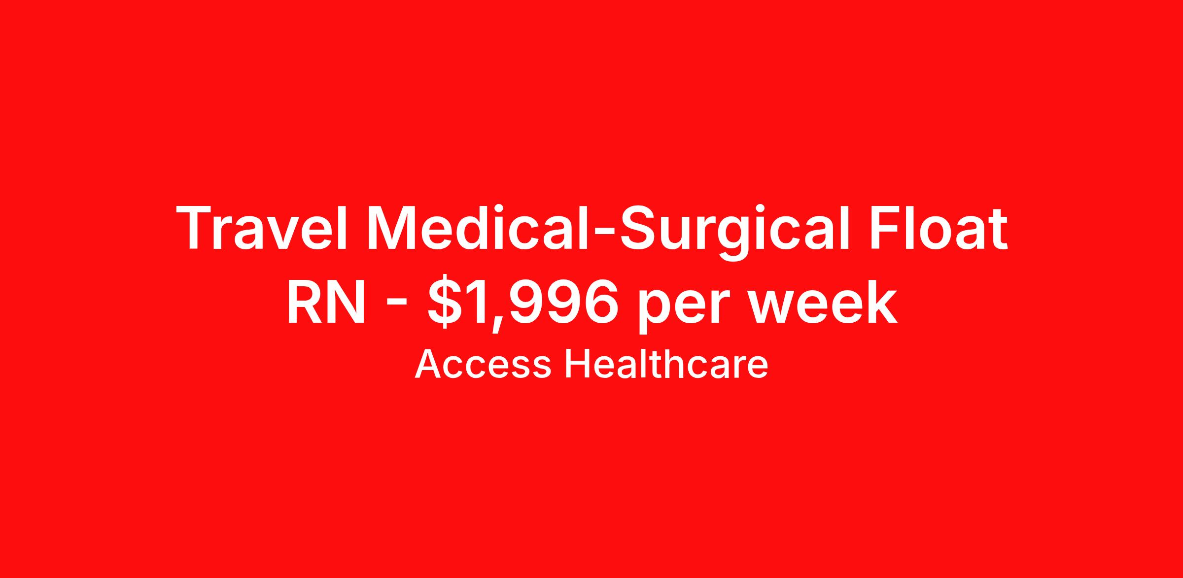 Access Healthcare is seeking a travel nurse RN Float Med Surg for a travel nursing job in Huntington, West Virginia. Job Description & Requirements Specialty: Med Surg Discipline: RN Start Date: 04/13/2026 Duration: 13 weeks 36 hours per week Shift: 12 hours, nights Employment Type: Travel Access Healthcare Job ID 76112616. Pay package is based on 12 hour shifts and 36 hours per week (subject to confirmation) with tax-free stipend amount to be determined. About Access Healthcare Access Healthcare aims to provide superior service to our nursing family by providing around the clock support, competitive pay packages and an unmatched benefits package! Unlike other agencies, we offer a true family feel and work with you to find the placement that is right for you. We offer one of the top leading pay packages in the industry and we are ready to get you the money you deserve! Access Healthcare was founded by two travel nurses, Danielle and Diego, who had a dream and a shared vision of creating an agency which all nurses would want to work with. Our passion has led us to where we are today as one of the top 10 agencies in our home state of New Jersey, with access to contracts in all 50 states! We encourage you to join our team and we cannot wait to get to know you!