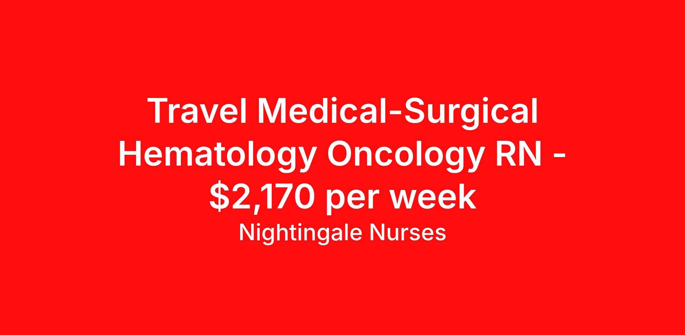 Nightingale Nurses is seeking a travel nurse RN Hematology / Oncology for a travel nursing job in Columbus, Ohio. Job Description & Requirements Specialty: Hematology / Oncology Discipline: RN Start Date: ASAP Duration: 16 weeks 36 hours per week Shift: 12 hours, nights Employment Type: Travel About Nightingale Nurses the first name in travel nursing You may not realize it, but as an RN with real world hospital experience, you are legendary. To the lives you’ve helped save, the patients you’ve cared for, and to the hospitals where you’ve done it. And you’re just getting started. Legendary is where Nightingale begins. We’re the first name in travel nursing, representing only the very best RNs. That’s why hospitals prefer us, allowing us to offer exceptional travel nursing assignments all over the US, as well as the highest pay rates and most extensive benefits in the industry. Nightingale facilitates every aspect of your travel nursing assignment, so you can focus on doing what you do best. We want you to grow, explore, and enjoy unrivaled liberty, the freedom to nurse.