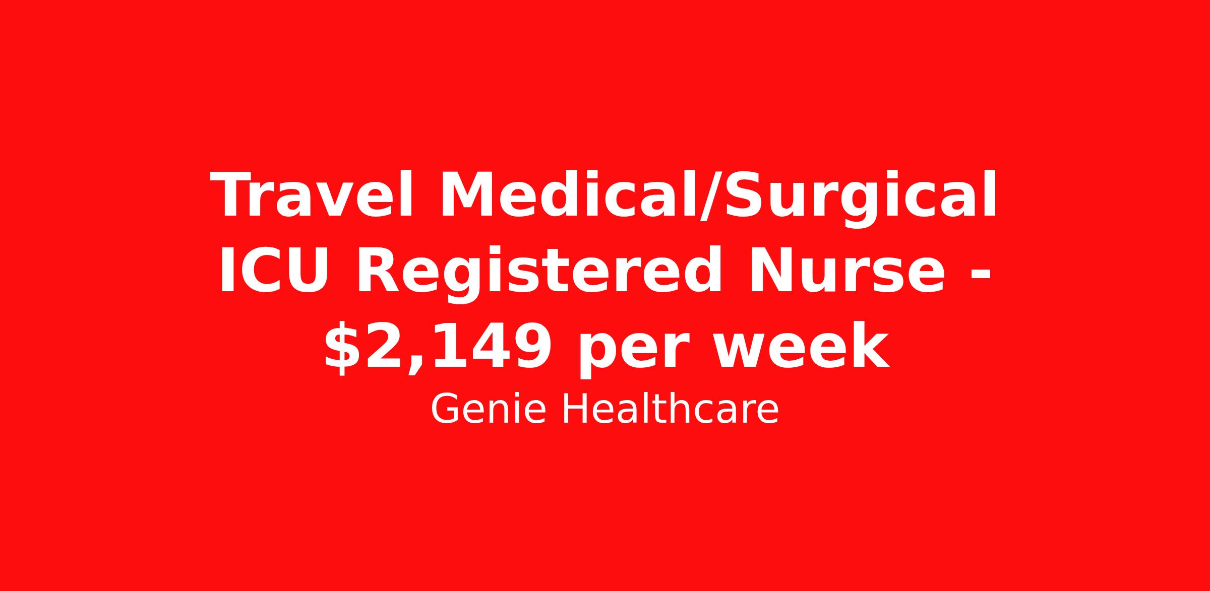 Genie Healthcare is seeking a travel nurse RN ICU - Intensive Care Unit for a travel nursing job in Prescott, Arizona. Job Description & Requirements Specialty: ICU - Intensive Care Unit Discipline: RN Start Date: 04/06/2026 Duration: 13 weeks 36 hours per week Shift: 12 hours, nights Employment Type: Travel Genie Healthcare is looking for a RN to work in Intensive Care Unit (ICU) for a 13 weeks travel assignment located in Prescott, AZ for the Shift (3x12 nights, 19:00:00-07:00:00, 12.00-3). Pay and benefits packages are estimated based on client bill rate at time the job was posted. These rates are subject to change. Exact pay and benefits vary based on several things, including, but not limited to, guaranteed hours, client changes in bill rate, experience, etc. Benefits: Medical Insurance, Dental Insurance, Vision Insurance, 401(k) with company matching (50% up to 6% of what you contribute) Genie Healthcare Job ID 17973335. Pay package is based on 12 hour shifts and 36.0 hours per week (subject to confirmation) with tax-free stipend amount to be determined. Posted job title: RN:Intensive Care Unit (ICU),19:00:00-07:00:00 About Genie Healthcare Genie Healthcare is one of the fastest growing Nurse Travel Agencies in the USA. Genie serves hundreds of facilities and has over 4000 current travel RN contracts open at any given time. Genie provides travel RN’s flexibility, support, top pay scale, housing and the 1 rated, multi-state health insurance coverage. Genie Healthcare carries with it a commitment to providing a comprehensive level of service and quality care. Growing from a small team of eager recruiters to a company with satisfied clients in nearly every corner of the nation, delivering excellence in patient and customer care is the key to Genie’s success. The management team has 20 years of experience in workforce solutions and staffing in medical and non-medical fields, roles ranging from Clerical job to Cardiologist to software developer to CEO.