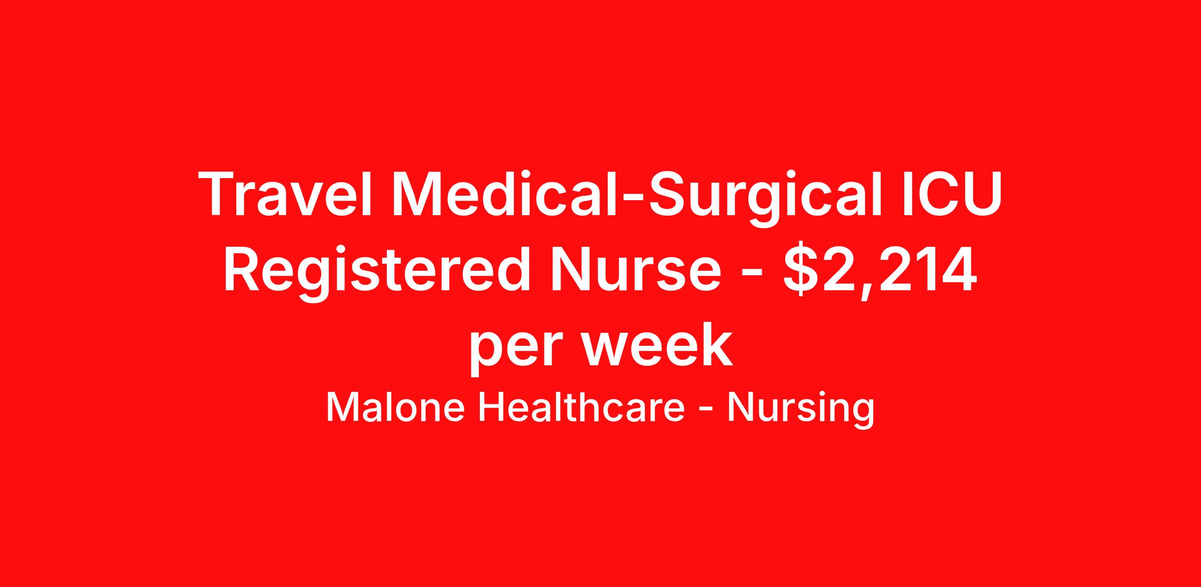 Malone Healthcare - Nursing is seeking a travel nurse RN SICU - Surgical Intensive Care for a travel nursing job in Midland, Michigan. Job Description & Requirements Specialty: SICU - Surgical Intensive Care Discipline: RN Start Date: 03/23/2026 Duration: 13 weeks 36 hours per week Shift: 12 hours, nights Employment Type: Travel Nights, 6:42P - 7:12A (12 Hour Nights) / 36 Hour Guarantee About Malone Healthcare - Nursing With a commitment to providing a higher standard of service and experience in patient care, Malone Healthcare places expert nurses and allied health professionals in rewarding careers throughout the United States. As a leading healthcare staffing agency, Malone’s focus on compliance and integrity translates to a seamless experience for our team members and partner facilities. When you work with Malone Healthcare, you can rely on over 50 years of proven experience placing exceptional professionals in quality healthcare settings. Benefits Weekly pay Holiday Pay Guaranteed Hours Continuing Education 401k retirement plan Pet insurance Referral bonus Medical benefits Dental benefits Vision benefits License and certification reimbursement Life insurance