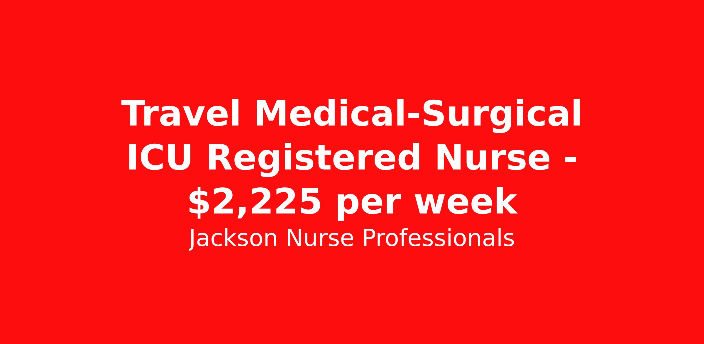 Jackson Nurse Professionals is seeking a travel nurse RN ICU - Intensive Care Unit for a travel nursing job in Midland, Michigan. Job Description & Requirements Specialty: ICU - Intensive Care Unit Discipline: RN Start Date: 04/13/2026 Duration: 13 weeks 36 hours per week Shift: 12 hours, days Employment Type: Travel At Jackson Nurse Professionals , we are dedicated to supporting travel nurses and helping you build a fulfilling nursing career. Whether you’re looking for your first or next travel nursing assignment, we specialize in connecting healthcare professionals with leading medical facilities. With a focus on personalized service and a wide range of opportunities, we make it easier than ever for nurses to find the right balance of adventure and professional growth. Qualifications: 2 years of recent experience in area of specialty listed on job Current BLS required (certifications vary by location – job may require ACLS) Valid license and/or certification in state of practice Valid Driver's License Background and drug screen Benefits: Full Medical, Dental and Vision Insurance 401(k) with Employer Match 24/7/365 Support from your Recruiter available by text, phone, or email Referral Bonus Program: Give $200, Get $500 for every referral Same Day Immediate Pay Access Certification & Licensure Reimbursement Apply today to experience the Jackson Nurse Professionals difference! Jackson Nurse Professionals Job ID 2474996. Pay package is based on 12 hour shifts and 36 hours per week (subject to confirmation) with tax-free stipend amount to be determined. About Jackson Nurse Professionals Filling critical needs in patient care, Jackson Nurse Professionals delivers cost-effective travel nurse staffing solutions to over 500 hospitals, outpatient clinics, and home health clients nationwide. Awarded Best of Staffing - Talent and Client 2024, and rated as a Top Workplace 2023 by the Orlando Sentinel, Jackson Nurse Professionals goes the extra mile to provide travel nurses the career they deserve, while providing clients with a large range of highly skilled nurses to fill short, long-term, and temporary assignments. As a member of Jackson Healthcare’s family of award-winning staffing companies, we’re part of a growing community that’s impacting 10 million patients nationwide. Join our mission to improve the delivery of patient care, and the lives of everyone we touch.