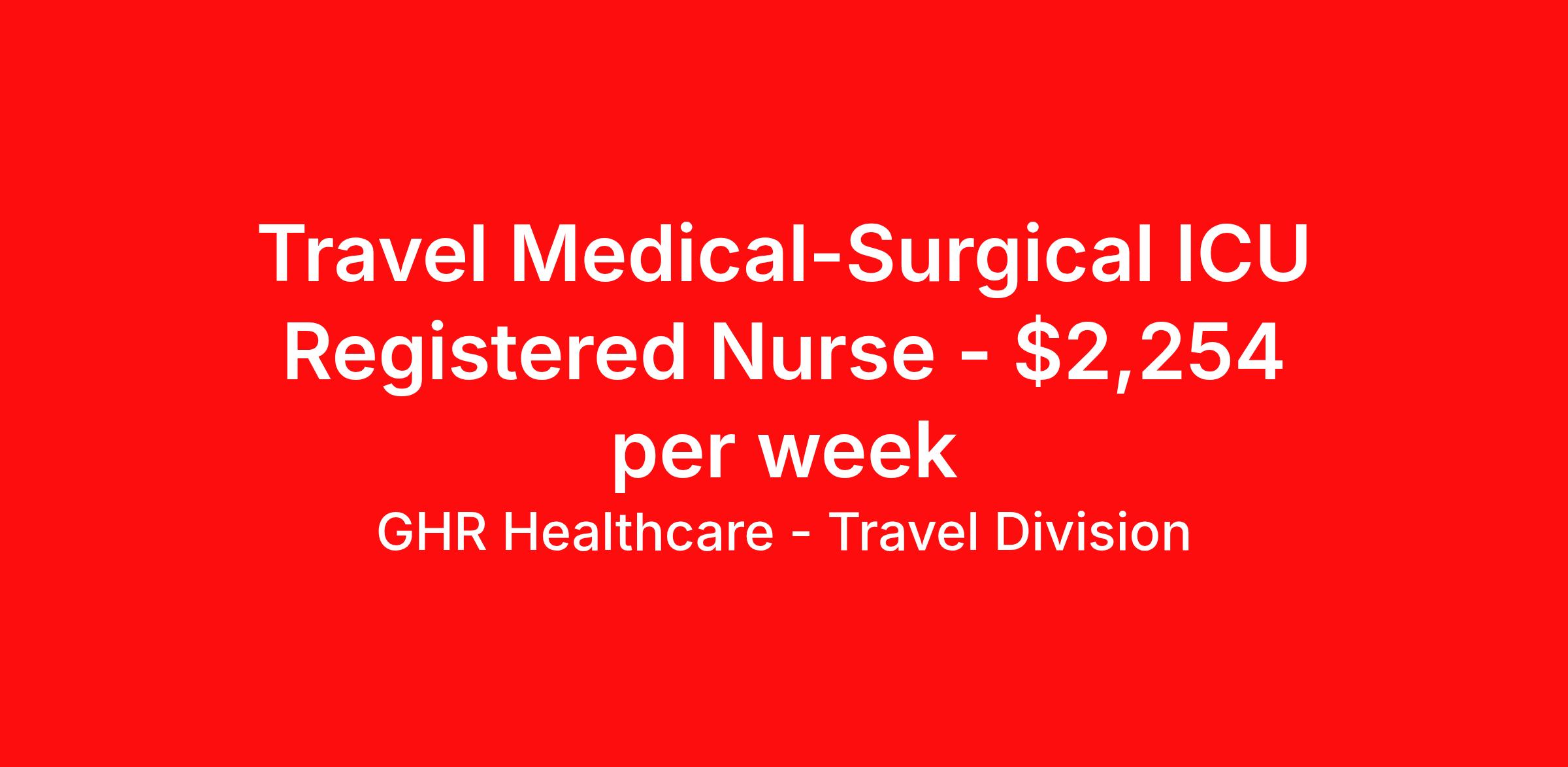 GHR Healthcare - Travel Division is seeking a travel nurse RN SICU - Surgical Intensive Care for a travel nursing job in Midland, Michigan. Job Description & Requirements Specialty: SICU - Surgical Intensive Care Discipline: RN Start Date: 04/13/2026 Duration: 13 weeks 36 hours per week Shift: 12 hours, nights Employment Type: Travel About GHR Healthcare - Travel Division For over 30 years, GHR Healthcare has been the bridge between healthcare professionals and the facilities that need them nationwide. We're committed to uncovering your ideal fit, supported by GHR's dedication to competitive compensation, transparent communication, and a devoted team that genuinely cares about your career journey. You can trust us to stand by your side as your advocate, confidante, and partner in advancing your career. At GHR, care and consideration are at the heart of everything we do. Visit ghrhealthcare.com to learn more.