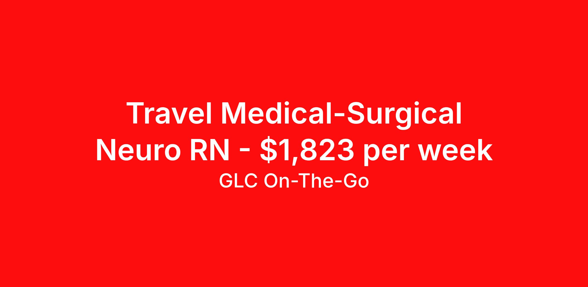 GLC On-The-Go is seeking a travel nurse RN Med Surg for a travel nursing job in Winston-Salem, North Carolina. Job Description & Requirements Specialty: Med Surg Discipline: RN Start Date: 04/06/2026 Duration: 13 weeks 36 hours per week Shift: 12 hours Employment Type: Travel GLC is hiring: RN Med Surg - Winston-Salem, NC - 13-week contract GLC – Named Best Nurse Agency 2024–2025 We connect nurses, nursing professionals, and allied health professionals like you to contracts that align with your skills, schedule, and career goals. About this Assignment Join the care team in Med Surg where you’ll provide patient-centered care in a collaborative environment. Typical responsibilities include direct patient care, timely documentation, and coordination with the care team. Specific duties will be confirmed during your interview with a recruiter. Assignment Details Location: Winston-Salem, NC Assignment Length: 13 weeks Start Date: 04/06/2026 End Date: 07/06/2026 Pay Range: $1,641 - $1,823 Minimum Requirements Active license in Med Surg 1 year full-time RN, Med Surg experience within the last 2 years What you can expect from GLC Weekly on-time pay with direct deposit Transparent communication, clear assignment details, and recruiter support from start to finish - or extension Referral bonus up to $500 Health, dental, and vision insurance 401(k) plan Completion and signing bonuses may also be available Ready to move forward? Apply now and start your rewarding journey with GLC - a recruiter will connect quickly to review pay , start date , and assignment details so you can make the best decision for your next contract. GLC On-The-Go Job ID 504102. Pay package is based on 12 hour shifts and 36 hours per week (subject to confirmation) with tax-free stipend amount to be determined. Posted job title: Medical Surgical - Neuro Registered Nurse About GLC On-The-Go GLC is more than just a staffing agency – we’re your trusted partner in finding travel, local, and PRN contracts that align with your career aspirations and lifestyle. We specialize in connecting travel nurses and allied healthcare professionals like you with opportunities in acute care, long-term care, behavioral health, and allied fields across the U.S. Our attentive and friendly recruiters are always just a call or text away, ready to guide you at every step, ensuring you feel valued and heard. We understand the unique needs of travel healthcare professionals, which is why we offer comprehensive benefits and 24/7 support. Join GLC, where our 20 years of experience mean we know how to help you find the assignments that turn your career goals into reality. With us, it's not just a placement – it's your dream career made possible