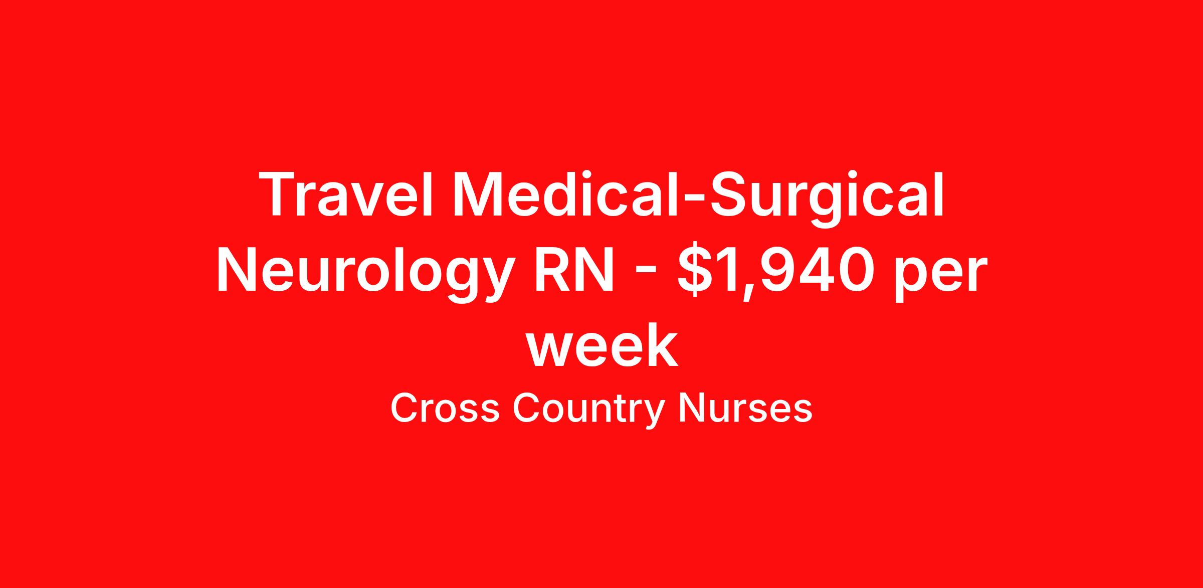 Cross Country Nurses is seeking a travel nurse RN Med Surg for a travel nursing job in St. Louis, Missouri. Job Description & Requirements Specialty: Med Surg Discipline: RN Start Date: 04/20/2026 Duration: 13 weeks 36 hours per week Shift: 12 hours, nights Employment Type: Travel Job Description As a medical/surgical nurse (RN M/S), you will extend bedside care to patients who are coping with illness, injury, or other medical or surgical circumstances. This includes assessing their condition, administering medication, changing dressings, monitoring vitals, and documenting in the patient charts. You're also responsible for providing continued support and education to patients, promoting their overall health and ensuring that they have the tools to adequately recuperate and prevent further health issues. Minimum Requirements At least 1 year of recent acute care experience in specialty Active RN license Benefits The benefits of taking a travel nursing job with Cross Country include: Private housing or generous housing allowance Comprehensive health insurance with prescription coverage Dependent health insurance with prescription coverage Competitive salaries Referral bonuses Travel reimbursement 401(k) retirement plan Direct deposit/free checking Unlimited free CE credits Cross Country Job ID 1236866. Pay package is based on 12 hour shifts and 36 hours per week (subject to confirmation) with tax-free stipend amount to be determined. Posted job title: Registered Nurse / Medical Surgical Neurology Floor About Cross Country Nurses You care for others — we’re here to care for you. At Cross Country, we know travel nursing is about more than just the job. It’s about building a career that supports your lifestyle, your values, and your impact. We offer competitive pay, full benefits, and 24/7 support from a team that truly understands what it means to be on the front lines. Wherever your journey takes you, we’re with you every step of the way. Let’s build your best life — one assignment at a time. Benefits 401k retirement plan Referral bonus