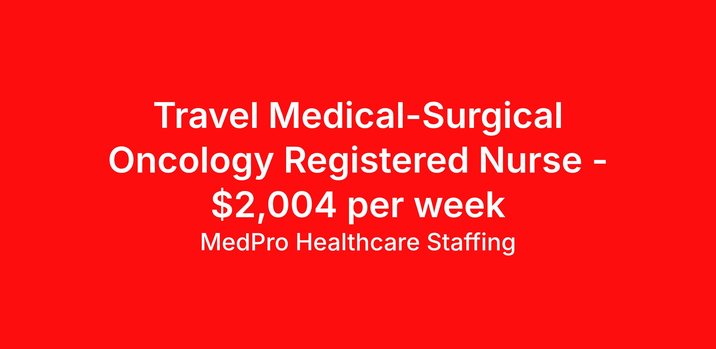 MedPro Healthcare Staffing is seeking a travel nurse RN Oncology Med Surg for a travel nursing job in Albany, Georgia. Job Description & Requirements Specialty: Oncology Discipline: RN Start Date: 04/06/2026 Duration: 13 weeks 36 hours per week Shift: 12 hours, days Employment Type: Travel MedPro Healthcare Staffing , a Joint Commission-certified staffing agency, is seeking a quality Oncology Registered Nurse (RN) for a travel assignment with one of our top healthcare clients. Requirements Active RN License Degree from accredited nursing program BLS & ACLS Certifications Eighteen months of recent experience in an Acute Care Oncology setting Other requirements to be determined by our client facility Benefits Weekly pay and direct deposit Full coverage of all credentialing fees Private housing or housing allowance Group Health insurance for you and your family Company-paid life and disability insurance Travel reimbursement 401(k) matching Unlimited Referral Bonuses up to $1,000 Duties Responsibilities The Oncology RN will care for critically or chronically ill cancer patients. They will administer chemotherapy, implement new methods of symptom treatment and monitor their patients' progress. Oncology nurses also create a supportive environment. They may opt to specialize in areas such as pediatric hematology/oncology or breast cancer. Provide care for cancer patients throughout all stages of their conditions, but usually focusing on the acute phase. Assist patients ranging from post-surgical to near-terminal manage their disease and treatment effectively, and may also be responsible for administering chemotherapy. Educate cancer patients about treatment options, procedures and particularities of the disease. About Agency MedPro Healthcare Staffing is a Joint Commission certified provider of contract staffing services. Since 1983, we have placed nursing and allied travelers in top healthcare facilities nationwide. Join us today for your very own MedPro Experience®. If qualified and interested, please call for immediate consideration. MedPro Staffing is an Equal Opportunity Employer. All applicants will be considered for employment without attention to race, color, religion, national origin, age, sex, disability, marital status or veteran status. Key Words: Registered Nurse, RN, Oncology, Contract Nurse, Travel Nurse, Agency RN, Travel RN, Nursing, Contract *Weekly payment estimates are intended for informational purposes only and include a gross estimate of hourly wages and reimbursements for meal, incidental, and housing expenses. Your recruiter will confirm your eligibility and provide additional details. MedPro Job ID a0Fcx00000H5Rx4EAF. Pay package is based on 12 hour shifts and 36 hours per week (subject to confirmation) with tax-free stipend amount to be determined. Posted job title: Oncology Registered Nurse Nursing: Oncology. About MedPro Healthcare Staffing At MedPro Healthcare Staffing , we believe no one cares more for caregivers than we do. Our mission is simple: you focus on your patients, and we’ll take care of the rest. As a Joint Commission-certified leader in temporary and contract healthcare staffing since 1983, MedPro has proudly connected nursing and allied travelers with top healthcare facilities across the nation. With thousands of job opportunities available nationwide, we make it easy to find assignments that align with your goals and lifestyle. Our on-staff clinical support team—alongside a compassionate group of experienced recruiters—provides hands-on guidance every step of the way. From Day 1 medical benefits and a 401(k) plan to personalized career support, we’re committed to ensuring every professional we serve feels valued, cared for, and empowered to succeed. Guided by a CEO who is a Registered Nurse, MedPro is built on a foundation of clinical insight and genuine compassion for the caregiving community. Through The MedPro Experience® , we deliver travel assignments that are rewarding, memorable, and designed to help you DREAM big, EXPLORE often, and ACHIEVE greatness. Benefits Day 1 medical, dental, and vision benefits for you and your family Weekly pay and direct deposit Unlimited Referral Bonuses starting at $500 On Staff Clinical Support Team Access to nationwide travel assignments MPX Mobile app -24/7 real-time access to jobs, credentials, assignment details, and more Full coverage of all credentialing fees Private housing or housing allowance Tax Free Per Diems, Housing Stipends and Travel Reimbursements Company-paid life and disability insurance Travel reimbursement 401(k) matching Benefits Weekly pay Referral bonus Employee assistance programs