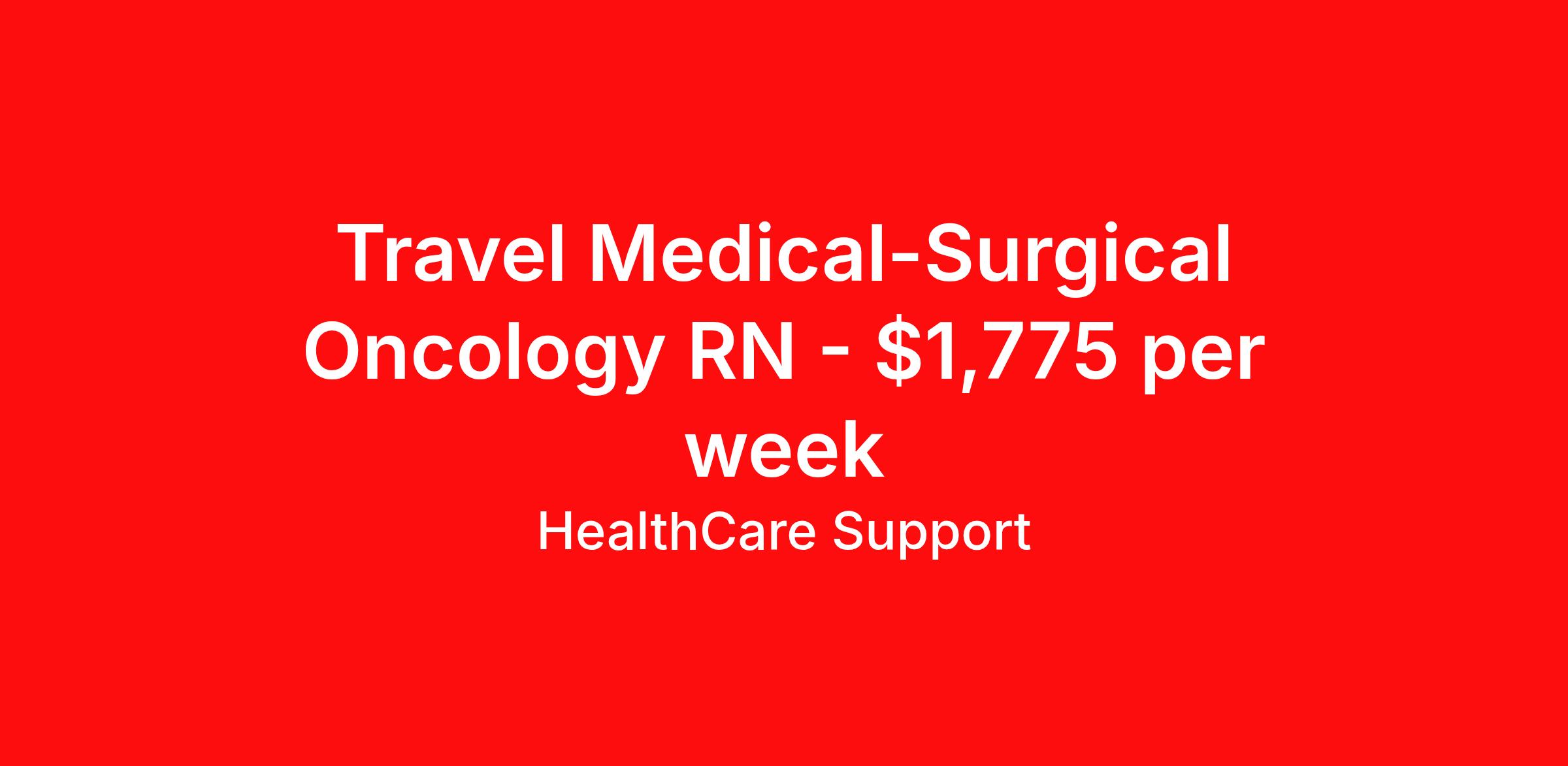 Healthcare Support is seeking a travel nurse RN Oncology Med Surg for a travel nursing job in Atlanta, Georgia. Job Description & Requirements Specialty: Oncology Discipline: RN Start Date: 04/06/2026 Duration: 8 weeks 36 hours per week Shift: 12 hours Employment Type: Travel Healthcare Support Job ID 495304. Pay package is based on 12 hour shifts and 36 hours per week (subject to confirmation) with tax-free stipend amount to be determined. Posted job title: rn med surg - oncology About Healthcare Support Healthcare Support excels at providing a streamlined and red-carpet experience for our travelers. Whether you are a nurse, a therapist, or an allied health professional, our goal is to connect you with top-rated facilities throughout the country and get you on the road to your next adventure. We leverage 20 years of relationships with the industry’s most respectable companies across all 50 states, both through direct client partnerships and via national MSP programs. From health systems and hospitals to specialty clinics and post-acute facilities, you can work where you want to work and go where you want to go. Not only does HealthCare Support reimburse for relocation and travel costs on your first check, but we also offer license and certification reimbursements required for your assignments so that you can focus on building your career. During your assignment, you’ll have access to medical benefits, 24/7 support from our Clinical Advocacy Team, and a travel team with stateside operations. Your travel team will include a designated credentialing expert to help you navigate every step of the on-boarding process, a payroll specialist who you can communicate with directly, and a skilled recruiter who takes the time to understand your needs and works hard to find the right position for you. Don’t get lost in the shuffle of another overblown staffing agency. Choose HealthCare Support to be your trusted partner that you can rely on for all your travel assignments. We can’t wait to hear about the amazing adventures you’ll have! Pst! Ask us about our Direct Hire Opportunities! Benefits License and certification reimbursement Medical benefits Dental benefits Mileage reimbursement Employee assistance programs Referral bonus 401k retirement plan Holiday Pay Weekly pay