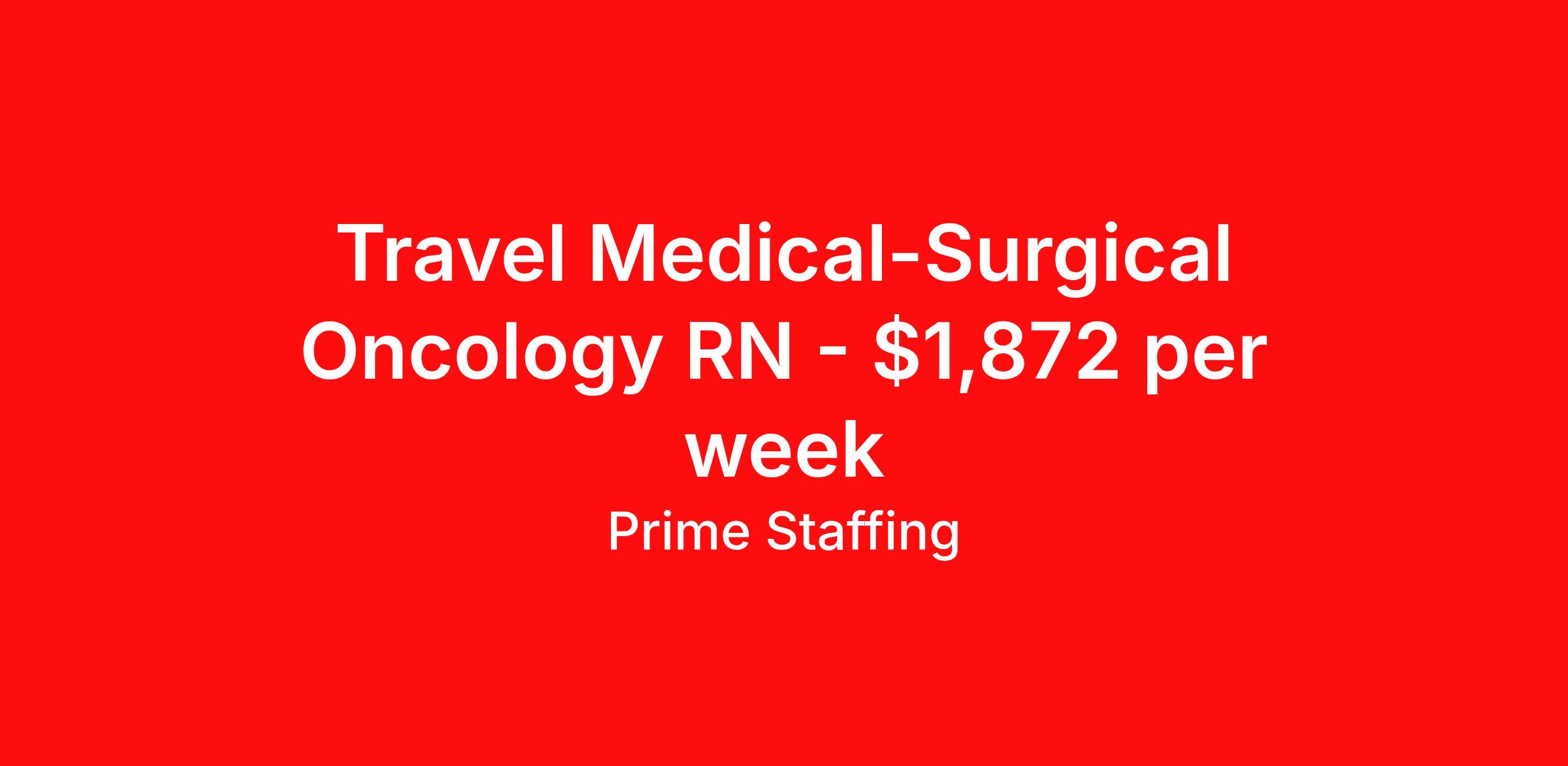 Prime Staffing is seeking a travel nurse RN Oncology Med Surg for a travel nursing job in Memphis, Tennessee. Job Description & Requirements Specialty: Oncology Discipline: RN Start Date: 04/20/2026 Duration: 13 weeks 36 hours per week Shift: 12 hours Employment Type: Travel About the Position Specialty: RN – Oncology Experience: 1–2 years in oncology or infusion preferred License: Active State or Compact RN License Certifications: BLS – AHA; ONS Chemotherapy/Biotherapy Certification preferred Must-Have: Experience with central lines, chemotherapy administration, and symptom management Description: The Oncology RN provides compassionate care to patients undergoing cancer treatment. Responsibilities include chemotherapy and medication administration, monitoring for adverse reactions, patient education, and emotional support. The RN collaborates with oncologists and multidisciplinary teams to deliver personalized care plans and manage complex symptoms. Requirements Required for Onboarding: Active RN License BLS Prime Staffing Job ID 35898455. Pay package is based on 12 hour shifts and 36.0 hours per week (subject to confirmation) with tax-free stipend amount to be determined. Posted job title: RN:Oncology,19:00:00-07:30:00 About Prime Staffing At Prime Staffing, we understand the importance of finding the perfect fit for both our clients and candidates. Prime Staffing utilizes a unique matchmaking approach, providing the most qualified contingent staffing to our clients, and the most competitive contracts to our workforce. Our experienced team takes the time to get to know both our clients and candidates, their needs, and preferences, to ensure that each placement is a success. We offer a wide range of staffing services including temporary, temp-to-perm, and direct hire placements. Our extensive network of qualified candidates includes nurses, allied healthcare professionals, corporate support professionals and executives.