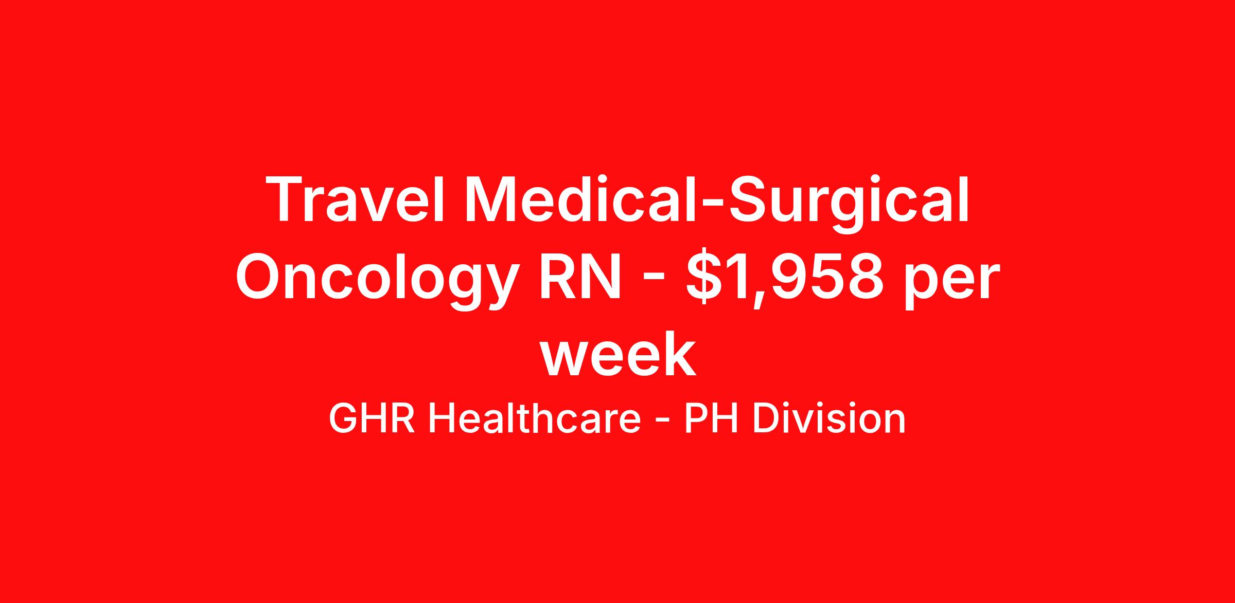 GHR Healthcare - PH Division is seeking a travel nurse RN Oncology Med Surg for a travel nursing job in Memphis, Tennessee. Job Description & Requirements Specialty: Oncology Discipline: RN Start Date: 04/20/2026 Duration: 13 weeks 36 hours per week Shift: 12 hours Employment Type: Travel Planet Healthcare Job ID 75845195. Pay package is based on 12 hour shifts and 36 hours per week (subject to confirmation) with tax-free stipend amount to be determined. About GHR Healthcare - PH Division For over 30 years, GHR Healthcare has been the bridge between healthcare professionals and the facilities that need them nationwide. We're committed to uncovering your ideal fit, supported by GHR's dedication to competitive compensation, transparent communication, and a devoted team that genuinely cares about your career journey. You can trust us to stand by your side as your advocate, confidante, and partner in advancing your career. At GHR, care and consideration are at the heart of everything we do. Visit ghrhealthcare.com to learn more.