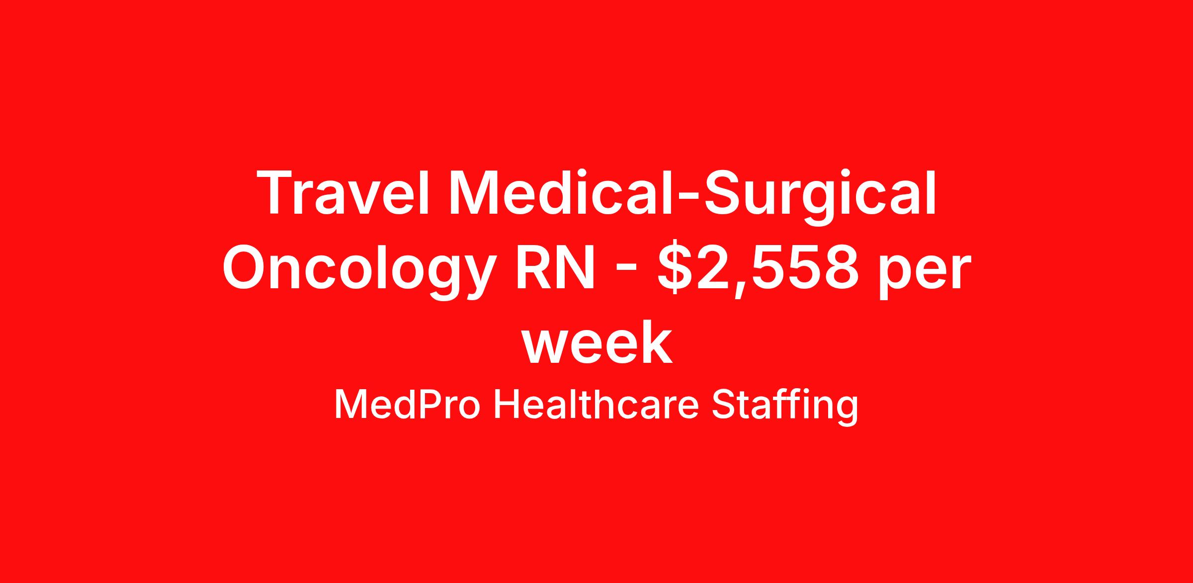 MedPro Healthcare Staffing is seeking a travel nurse RN Oncology Med Surg for a travel nursing job in Memphis, Tennessee. Job Description & Requirements Specialty: Oncology Discipline: RN Start Date: 04/20/2026 Duration: 13 weeks 48 hours per week Shift: 12 hours, nights Employment Type: Travel MedPro Healthcare Staffing , a Joint Commission-certified staffing agency, is seeking a quality Oncology Registered Nurse (RN) for a travel assignment with one of our top healthcare clients. Requirements Active RN License Degree from accredited nursing program BLS & ACLS Certifications Eighteen months of recent experience in an Acute Care Oncology setting Other requirements to be determined by our client facility Benefits Weekly pay and direct deposit Full coverage of all credentialing fees Private housing or housing allowance Group Health insurance for you and your family Company-paid life and disability insurance Travel reimbursement 401(k) matching Unlimited Referral Bonuses up to $1,000 Duties Responsibilities The Oncology RN will care for critically or chronically ill cancer patients. They will administer chemotherapy, implement new methods of symptom treatment and monitor their patients' progress. Oncology nurses also create a supportive environment. They may opt to specialize in areas such as pediatric hematology/oncology or breast cancer. Provide care for cancer patients throughout all stages of their conditions, but usually focusing on the acute phase. Assist patients ranging from post-surgical to near-terminal manage their disease and treatment effectively, and may also be responsible for administering chemotherapy. Educate cancer patients about treatment options, procedures and particularities of the disease. About Agency MedPro Healthcare Staffing is a Joint Commission certified provider of contract staffing services. Since 1983, we have placed nursing and allied travelers in top healthcare facilities nationwide. Join us today for your very own MedPro Experience®. If qualified and interested, please call for immediate consideration. MedPro Staffing is an Equal Opportunity Employer. All applicants will be considered for employment without attention to race, color, religion, national origin, age, sex, disability, marital status or veteran status. Key Words: Registered Nurse, RN, Oncology, Contract Nurse, Travel Nurse, Agency RN, Travel RN, Nursing, Contract *Weekly payment estimates are intended for informational purposes only and include a gross estimate of hourly wages and reimbursements for meal, incidental, and housing expenses. Your recruiter will confirm your eligibility and provide additional details. MedPro Job ID a0Fcx00000ErExdEAF. Pay package is based on 12 hour shifts and 48 hours per week (subject to confirmation) with tax-free stipend amount to be determined. Posted job title: Oncology Registered Nurse Nursing: Oncology. About MedPro Healthcare Staffing At MedPro Healthcare Staffing , we believe no one cares more for caregivers than we do. Our mission is simple: you focus on your patients, and we’ll take care of the rest. As a Joint Commission-certified leader in temporary and contract healthcare staffing since 1983, MedPro has proudly connected nursing and allied travelers with top healthcare facilities across the nation. With thousands of job opportunities available nationwide, we make it easy to find assignments that align with your goals and lifestyle. Our on-staff clinical support team—alongside a compassionate group of experienced recruiters—provides hands-on guidance every step of the way. From Day 1 medical benefits and a 401(k) plan to personalized career support, we’re committed to ensuring every professional we serve feels valued, cared for, and empowered to succeed. Guided by a CEO who is a Registered Nurse, MedPro is built on a foundation of clinical insight and genuine compassion for the caregiving community. Through The MedPro Experience® , we deliver travel assignments that are rewarding, memorable, and designed to help you DREAM big, EXPLORE often, and ACHIEVE greatness. Benefits Day 1 medical, dental, and vision benefits for you and your family Weekly pay and direct deposit Unlimited Referral Bonuses starting at $500 On Staff Clinical Support Team Access to nationwide travel assignments MPX Mobile app -24/7 real-time access to jobs, credentials, assignment details, and more Full coverage of all credentialing fees Private housing or housing allowance Tax Free Per Diems, Housing Stipends and Travel Reimbursements Company-paid life and disability insurance Travel reimbursement 401(k) matching Benefits Weekly pay Referral bonus Employee assistance programs