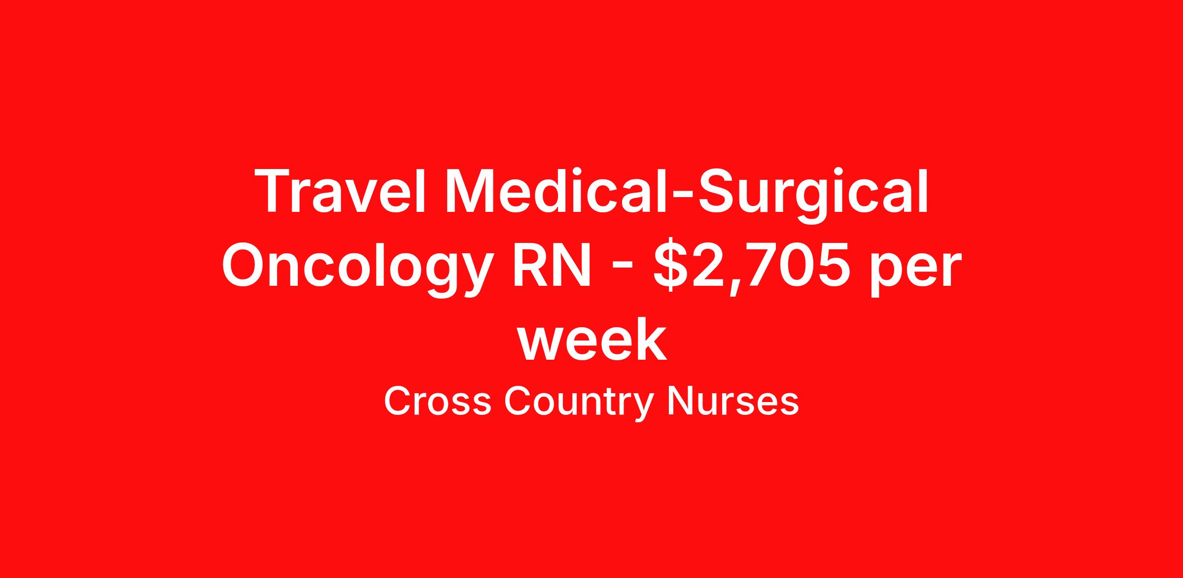 Cross Country Nurses is seeking a travel nurse RN Hematology / Oncology Med Surg for a travel nursing job in Palo Alto, California. Job Description & Requirements Specialty: Hematology / Oncology Discipline: RN Start Date: 04/06/2026 Duration: 26 weeks 40 hours per week Shift: 10 hours, days Employment Type: Travel Job Description As a medical/surgical chemotherapy-certified oncology nurse (RN M/S-Onc), you will extend care to patients who are receiving chemotherapy treatment for cancer. This includes assessing their condition, starting intravenous (IV) lines, administering chemotherapy, changing dressings, monitoring vitals and documenting in patient charts. You'll also provide moral support and education to patients and families, promoting health, helping prevent disease and ensuring they have the tools to recover and prevent further health issues. Minimum Requirements At least 1 year of recent acute care experience in specialty Active RN license Benefits The benefits of taking a travel nursing job with Cross Country include: Private housing or generous housing allowance Comprehensive health insurance with prescription coverage Dependent health insurance with prescription coverage Competitive salaries Referral bonuses Travel reimbursement 401(k) retirement plan Direct deposit/free checking Unlimited free CE credits Cross Country Job ID 1227802. Pay package is based on 10 hour shifts and 40 hours per week (subject to confirmation) with tax-free stipend amount to be determined. Posted job title: Registered Nurse / Medical Surgical Oncology Floor About Cross Country Nurses You care for others — we’re here to care for you. At Cross Country, we know travel nursing is about more than just the job. It’s about building a career that supports your lifestyle, your values, and your impact. We offer competitive pay, full benefits, and 24/7 support from a team that truly understands what it means to be on the front lines. Wherever your journey takes you, we’re with you every step of the way. Let’s build your best life — one assignment at a time. Benefits 401k retirement plan Referral bonus