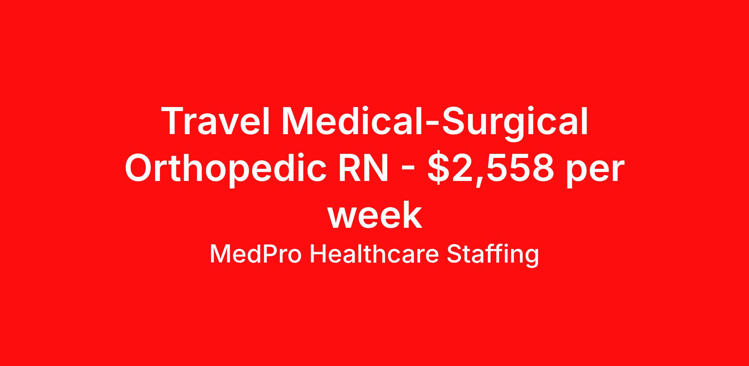 MedPro Healthcare Staffing is seeking a travel nurse RN Med Surg for a travel nursing job in Memphis, Tennessee. Job Description & Requirements Specialty: Med Surg Discipline: RN Start Date: 04/20/2026 Duration: 13 weeks 48 hours per week Shift: 12 hours, days Employment Type: Travel MedPro Healthcare Staffing , a Joint Commission-certified staffing agency, is seeking a quality Med-Surg registered nurse (RN) for a travel assignment with one of our top healthcare clients. Requirements Active RN License Degree from accredited nursing program BLS Certifications Eighteen months of recent experience in an Acute Care Med/Surg setting Other requirements to be determined by our client facility Benefits Weekly pay and direct deposit Full coverage of all credentialing fees Private housing or housing allowance Group Health insurance for you and your family Company-paid life and disability insurance Travel reimbursement 401(k) matching Unlimited Referral Bonuses up to $1,000 Duties Responsibilities Med-Surg Nurses (RN) provide care for primarily adult patients before and after surgical procedures; they also attend to those who are being treated with pharmaceuticals to manage illness. Due to the broad range of medical conditions Med/Surg Nurses will encounter, they must be well-versed in a large variety of health conditions. Complete assignments made by physicians. Provide routine treatment and post-surgical care. Assess changes in patient's health status and perform various treatments. Administer medication. Meticulous documentation as to medication and treatment administration to ensure continuity of care between nursing staff, physicians and other treatment team members. About Agency MedPro Healthcare Staffing is a Joint Commission certified provider of contract staffing services. Since 1983, we have placed nursing and allied travelers in top healthcare facilities nationwide. Join us today for your very own MedPro Experience®. If qualified and interested, please call for immediate consideration. MedPro Staffing is an Equal Opportunity Employer. All applicants will be considered for employment without attention to race, color, religion, national origin, age, sex, disability, marital status or veteran status. Key Words: Registered Nurse, RN, Medical-Surgical, Travel Nurse, Contract Nurse, Agency Nurse, Agency RN, RN-MS, RN- Medical Surgical, Travel RN, Contract, Nursing, RN Med-Surg, Travel Nursing *Weekly payment estimates are intended for informational purposes only and include a gross estimate of hourly wages and reimbursements for meal, incidental, and housing expenses. Your recruiter will confirm your eligibility and provide additional details. MedPro Job ID a0Fcx00000FsXrBEAV. Pay package is based on 12 hour shifts and 48 hours per week (subject to confirmation) with tax-free stipend amount to be determined. Posted job title: Med-Surg Registered Nurse Nursing: Medical Surgical. About MedPro Healthcare Staffing At MedPro Healthcare Staffing , we believe no one cares more for caregivers than we do. Our mission is simple: you focus on your patients, and we’ll take care of the rest. As a Joint Commission-certified leader in temporary and contract healthcare staffing since 1983, MedPro has proudly connected nursing and allied travelers with top healthcare facilities across the nation. With thousands of job opportunities available nationwide, we make it easy to find assignments that align with your goals and lifestyle. Our on-staff clinical support team—alongside a compassionate group of experienced recruiters—provides hands-on guidance every step of the way. From Day 1 medical benefits and a 401(k) plan to personalized career support, we’re committed to ensuring every professional we serve feels valued, cared for, and empowered to succeed. Guided by a CEO who is a Registered Nurse, MedPro is built on a foundation of clinical insight and genuine compassion for the caregiving community. Through The MedPro Experience® , we deliver travel assignments that are rewarding, memorable, and designed to help you DREAM big, EXPLORE often, and ACHIEVE greatness. Benefits Day 1 medical, dental, and vision benefits for you and your family Weekly pay and direct deposit Unlimited Referral Bonuses starting at $500 On Staff Clinical Support Team Access to nationwide travel assignments MPX Mobile app -24/7 real-time access to jobs, credentials, assignment details, and more Full coverage of all credentialing fees Private housing or housing allowance Tax Free Per Diems, Housing Stipends and Travel Reimbursements Company-paid life and disability insurance Travel reimbursement 401(k) matching Benefits Weekly pay Referral bonus Employee assistance programs