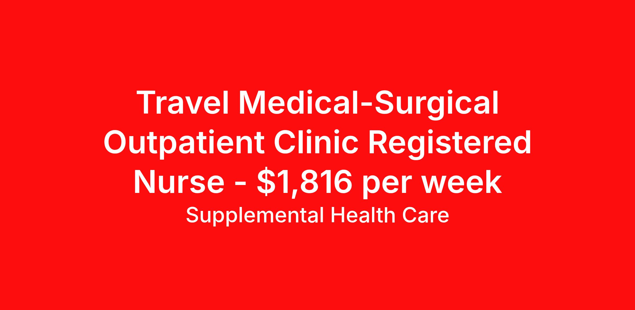 Supplemental Health Care is seeking a travel nurse RN Clinic Med Surg for a travel nursing job in Birmingham, Alabama. Job Description & Requirements Specialty: Med Surg Discipline: RN Start Date: ASAP Duration: 13 weeks 36 hours per week Shift: 12 hours, nights Employment Type: Travel Job Description: Supplemental Health Care is hiring Medical - Surgical Registered Nurses for full-time contract assignments at a partnering skilled nursing facility in Birmingham, Alabama. Whether you’re looking to travel or stay local, we’re committed to helping Medical - Surgical Registered Nurses find the right fit with top healthcare facilities across the country. With more than 40 years of experience in healthcare staffing, Supplemental Health Care offers reliable support, competitive pay, and great benefits every step of the way. Qualifications: Current Alabama Registered Nurse License / Certification American Heart Association BLS 1 to 2 years of recent relevant experience Registered Nurse Contract Details: $1,638 - $1,816 per week* 13-week contract with possibility to extend Shifts are usually 8 hours, Monday through Friday *Estimated weekly payment may include both taxable wages and tax-free reimbursements for meals, housing, and incidentals. Please speak with a recruiter for details. Apply today to get started with this Medical - Surgical Registered Nurse contract opportunity, or talk to our team about the full range of Registered Nurse opportunities available. What We Offer: Full medical, dental, vision, life, and even pet insurance! Round the clock support. No matter where you are or what time it is, Supplemental Health Care is standing by. SHC's Share the Care referral program is the most dynamic, profitable referral program in the industry. 401(k) Retirement Savings Program with a wide range of investment options. Discounted and free online access to CEU courses through Supplemental University. Supplemental Health Care is an Equal Opportunity Employer. All candidates, including veterans and those with disabilities, are encouraged to apply. SHC will consider for employment qualified applicants with criminal histories in a manner consistent with the requirements of applicable local, state, or federal law. To learn more, visit www.shccares.com/eeo Supplemental Health Care Job ID 1471761. Pay package is based on 12 hour shifts and 36 hours per week (subject to confirmation) with tax-free stipend amount to be determined. Posted job title: Clinic Registered Nurse About Supplemental Health Care At Supplemental Health Care, a simple belief in the power of caring guides a unique commitment to world-class service in healthcare staffing. For 40 years, we’ve supported talented professionals pursuing their life calling in hospitals, schools, home health, corrections, behavioral health, and other settings. At SHC, we inspire vital connections and enrich lives and inspire better outcomes. As recipients of the Best in Staffing Awards for both Client and Talent, Supplemental Health Care is proud to be among only 2% of staffing companies singled out for the distinction based on the real feedback of our employees and the clients we serve. SHC has also earned The Joint Commission’s Gold Seal of Approval and is named among the Largest Health Care Staffing companies in the United States by Staffing Industry Analysts. We are also thrilled to recognize our very own SLP, Dr. Kelly Byrd as the American Staffing Association 2024 National Staffing Employee of the Year and Health Care Sector All-Star. We’re honored to connect Dr. Byrd to employment, share her incredible story, and support her family literacy nonprofit. For everyone that we serve, SHC is the place where caring hearts thrive. Benefits Referral bonus Benefits start day 1 401k retirement plan Continuing Education Discount program Health savings account