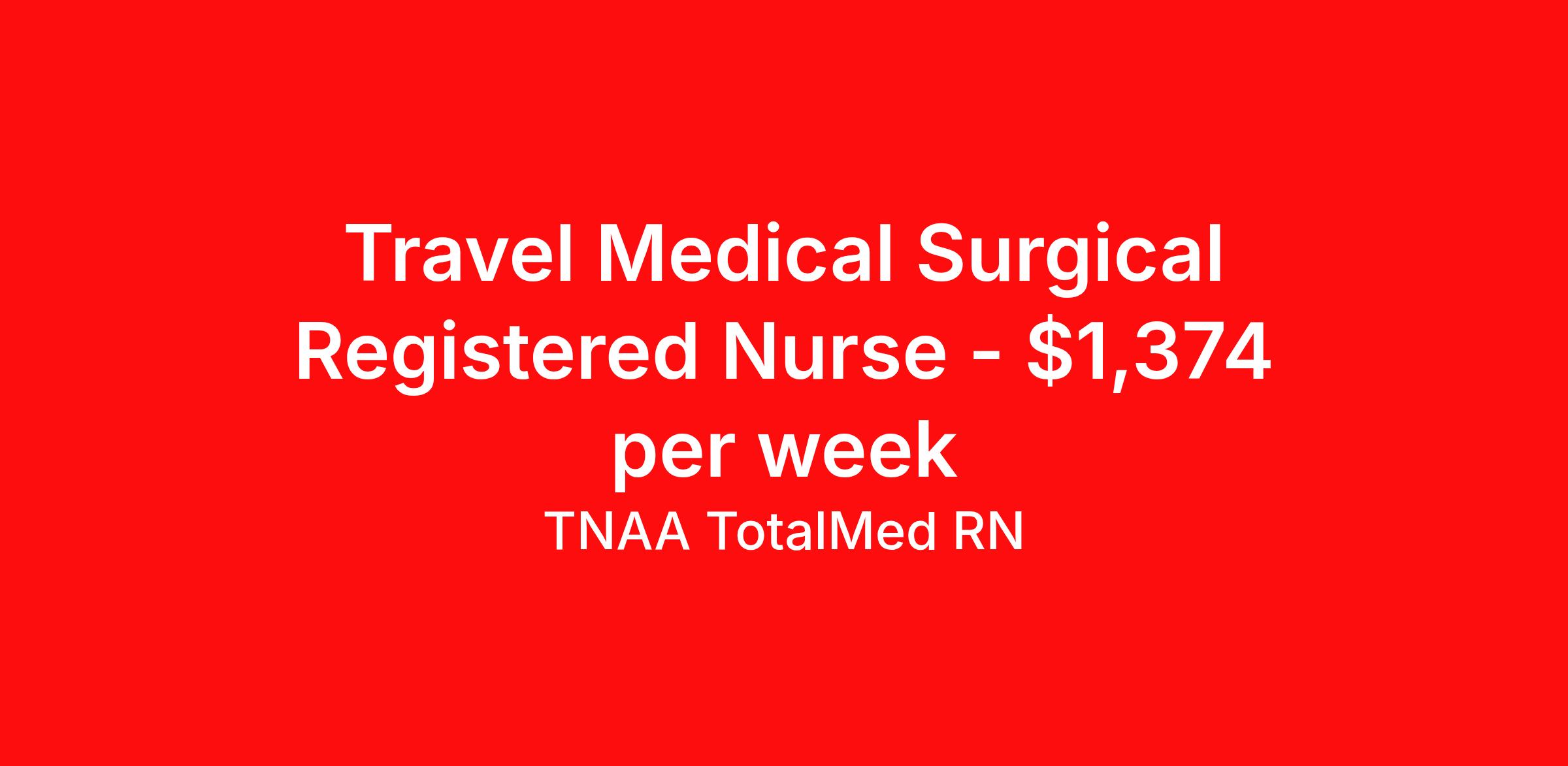 TNAA TotalMed RN is seeking a travel nurse RN Med Surg for a travel nursing job in Amarillo, Texas. Job Description & Requirements Specialty: Med Surg Discipline: RN Duration: 13 weeks 36 hours per week Shift: 12 hours, nights Employment Type: Travel We're looking for Medical Surgical RNs for an immediate travel nurse opening in Amarillo, TX. The right RN should have 1-2 years recent acute care experience. Read below for more requirements. As a MedSurg RN, you will conduct patient assessments and prioritize data collection based on patients' immediate conditions or needs. MedSurg RNs perform ongoing assessments and appropriate treatments as ordered by a physician. Documenting patient findings and providing education and support to patients' families is essential to this travel nurse position. As a Medical Surgical Travel Nurse, you should be prepared to perform the following tasks: Provide bedside care for a variety of patients, including pre- and post-op patients. Prepare, administer and record prescribed medication, reporting any adverse reactions to treatment. Change dressings, insert catheters and start IVs. Prepares equipment and aids physician during examination and treatment of patient. Educates patients on surgical procedures. Participates in discharge planning and initiates patient education plan as prescribed by physician. Medical Surgical Travel Nurses should be able to stand and walk for long periods of time, as well as bend, lean and stoop without difficulty. RNs should be able to easily lift 20 pounds. Moving or lifting of patients may require lifting of up to 50 pounds at times. RNs will work in a fast-paced environment treating patients that may be confused, agitated, and/or uncooperative. Requirements*: BLS, 1 Year * Additional certifications may be required before beginning an assignment. TotalMed Travel Job ID 1389280. Pay package is based on 12 hour shifts and 36 hours per week (subject to confirmation) with tax-free stipend amount to be determined. Posted job title: Medical/Surgical - MedSurg RN - Travel Nurse About TNAA TotalMed RN TotalMed is a Top Ten, travel nursing and healthcare staffing agency with the mission of igniting purpose in healthcare. The organization staffs nurses, therapists, pharmacists, and other clinicians of all specialties in all 50 states. They offer local and travel jobs and match caregivers with the right organization to assist both facilities and patients. As an organization, they focus on putting highly-skilled staff into facilities to ensure adequate staffing for a better patient experience. TotalMed specializes in recruiting and placing healthcare professionals in travel, PRN, and permanent positions across the country in Nursing and Allied Health. Throughout 2020, the organization filled roles at even the most short-staffed facilities during the most challenging time in healthcare. By matching the right travel healthcare professional with the right organization, TotalMed continues to offer a lifeline to facilities and their patients. Benefits Weekly pay Guaranteed Hours Continuing Education 401k retirement plan Sick pay Wellness and fitness programs Referral bonus Employee assistance programs Medical benefits Dental benefits Vision benefits Benefits start day 1