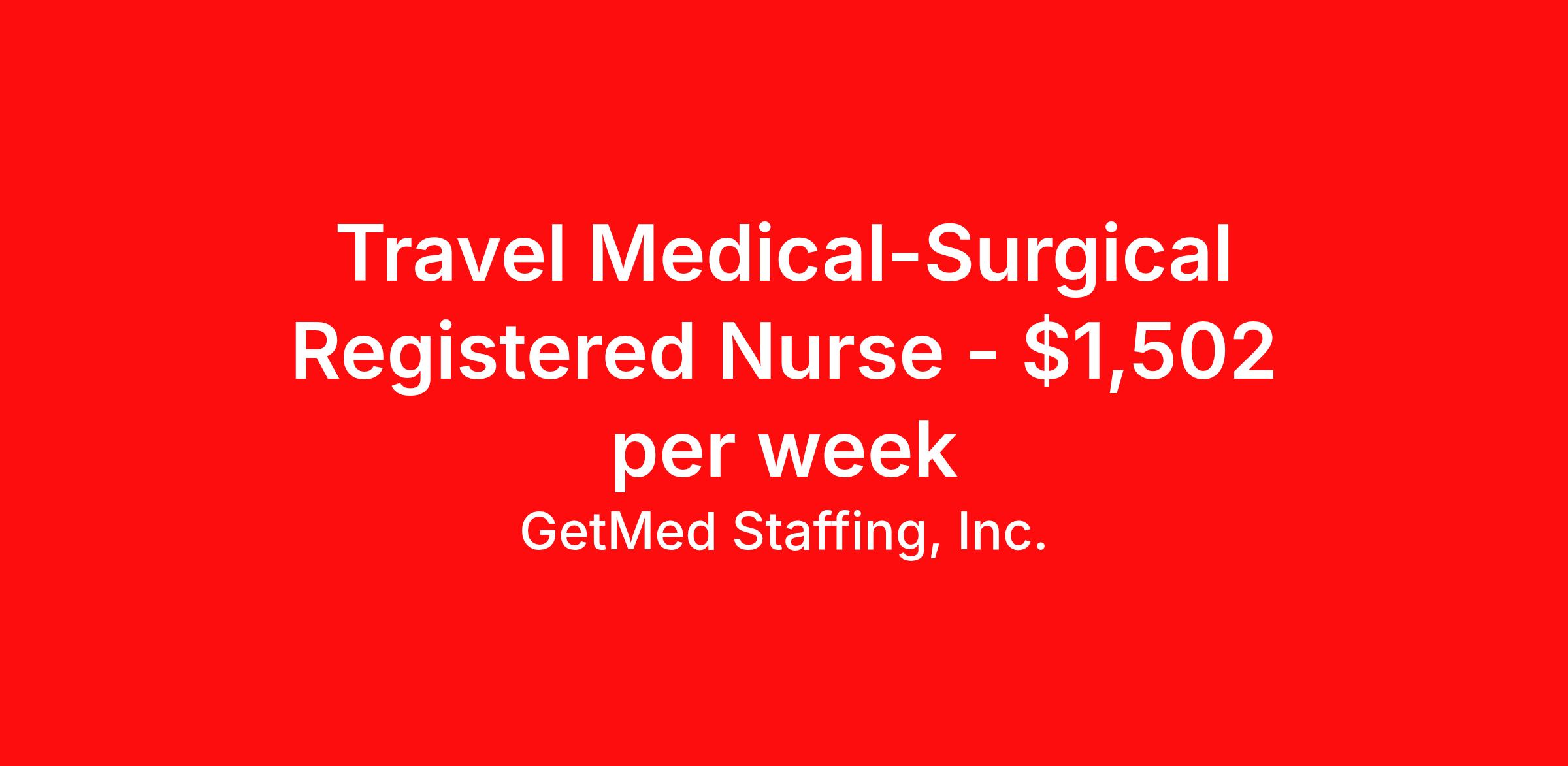 GetMed Staffing, Inc. is seeking a travel nurse RN Med Surg for a travel nursing job in Milan, Missouri. Job Description & Requirements Specialty: Med Surg Discipline: RN Start Date: 03/30/2026 Duration: 8 weeks 36 hours per week Shift: 12 hours, nights Employment Type: Travel GetMed Staffing is searching for a strong MedSurg RN to assist our traveler-friendly client. A minimum of 1-2 years of experience is required. Traveling with GetMed Staffing offers the unique opportunity to gain diverse experiences, both personally and professionally. Gain experience that matters. GetMed Staffing, Inc. Job ID 36079988. Pay package is based on 12 hour shifts and 36.0 hours per week (subject to confirmation) with tax-free stipend amount to be determined. Posted job title: RN:MedSurg,19:00:00-07:00:00 About GetMed Staffing, Inc. We are a diversity owned company, specializing in healthcare recruiting services. We truly understand how important a healthcare travelers' relationship is with their recruiter, as well as our relationship is with our healthcare facilities. We recognize that the needs of our healthcare travelers can vary, and therefore we provide the personalized touch necessary to ensure a successful travel assignment each and every time. Our healthcare facilities and clients benefit from us putting our healthcare travelers first. GetMed Staffing is excited to be a leader within the industry by focusing on providing healthcare travelers with more choices and possibilities as they plan for their next healthcare travel assignment. Benefits Life insurance Medical benefits Dental benefits Vision benefits 401k retirement plan