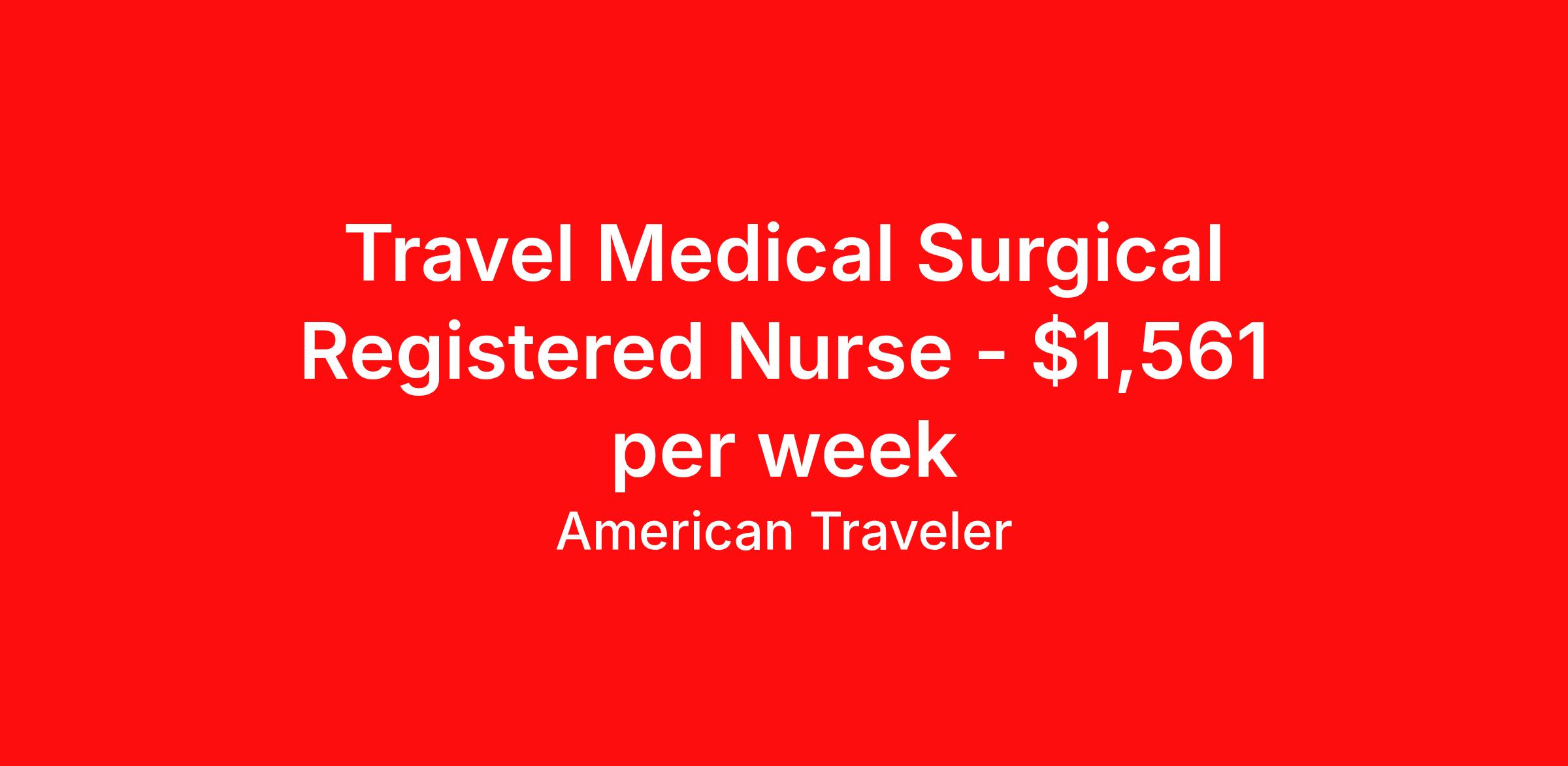 American Traveler is seeking a travel nurse RN Med Surg for a travel nursing job in Amarillo, Texas. Job Description & Requirements Specialty: Med Surg Discipline: RN Start Date: 03/30/2026 Duration: 13 weeks 36 hours per week Shift: 12 hours, nights Employment Type: Travel Assignment Overview Shift: Nights, 3x12hrs Hours: 36 hrs/wk Start Date: Mar 30, 2026 Length: 13 weeks Openings: 2 Description American Traveler is seeking an experienced RN for a Med/Surg position working night shifts with Epic experience preferred and a minimum of 1 year of RN experience required. Details Medical/Surgical unit in a hospital setting Nurse-to-patient ratio of 1:6 Unit consists of 10 beds Night shift schedule (7p–7:30a), with a choice of 3x12 or 4x12 hour shifts Epic EMR experience within the last 6 months is preferred 13-week contract Requirements Active TX or Compact RN license required Current BLS certification required Minimum 1 year of RN experience required 2 professional references from a supervisor within the past 2 years required for consideration Additional Information Candidates residing within 50 miles of the facility are not eligible for this position Former permanent staff must have been separated from the facility for at least 1 year before being eligible to return as a traveler Travel pairs or groups will not be accepted First-time travelers may be considered — check position details for eligibility No more than 3 days of RTO will be approved, and no RTO is permitted during the first week of orientation American Traveler Job ID P-679860. Pay package is based on 12 hour shifts and 36 hours per week (subject to confirmation) with tax-free stipend amount to be determined. Posted job title: Travel RN - Med/Surg About American Traveler With over 25 years of experience, American Traveler has established a reputation for outstanding customer service. Our team ensures a smooth, worry-free experience for those starting on or expanding their travel nursing and allied careers. With thousands of travel nursing and allied jobs nationwide, our attentive and approachable recruiters find positions that align perfectly with your career aspirations and personal requirements. American Traveler offers exceptional benefits, including premium medical, dental, vision and life insurance beginning day one of your assignment, generous 401(k) match, substantial housing stipends, and more. Additionally, with 24/7 support and access to our in-house clinicians, you are assured confidence and comfort throughout your assignment. With our team behind you, you can relax and enjoy a rewarding travel career.