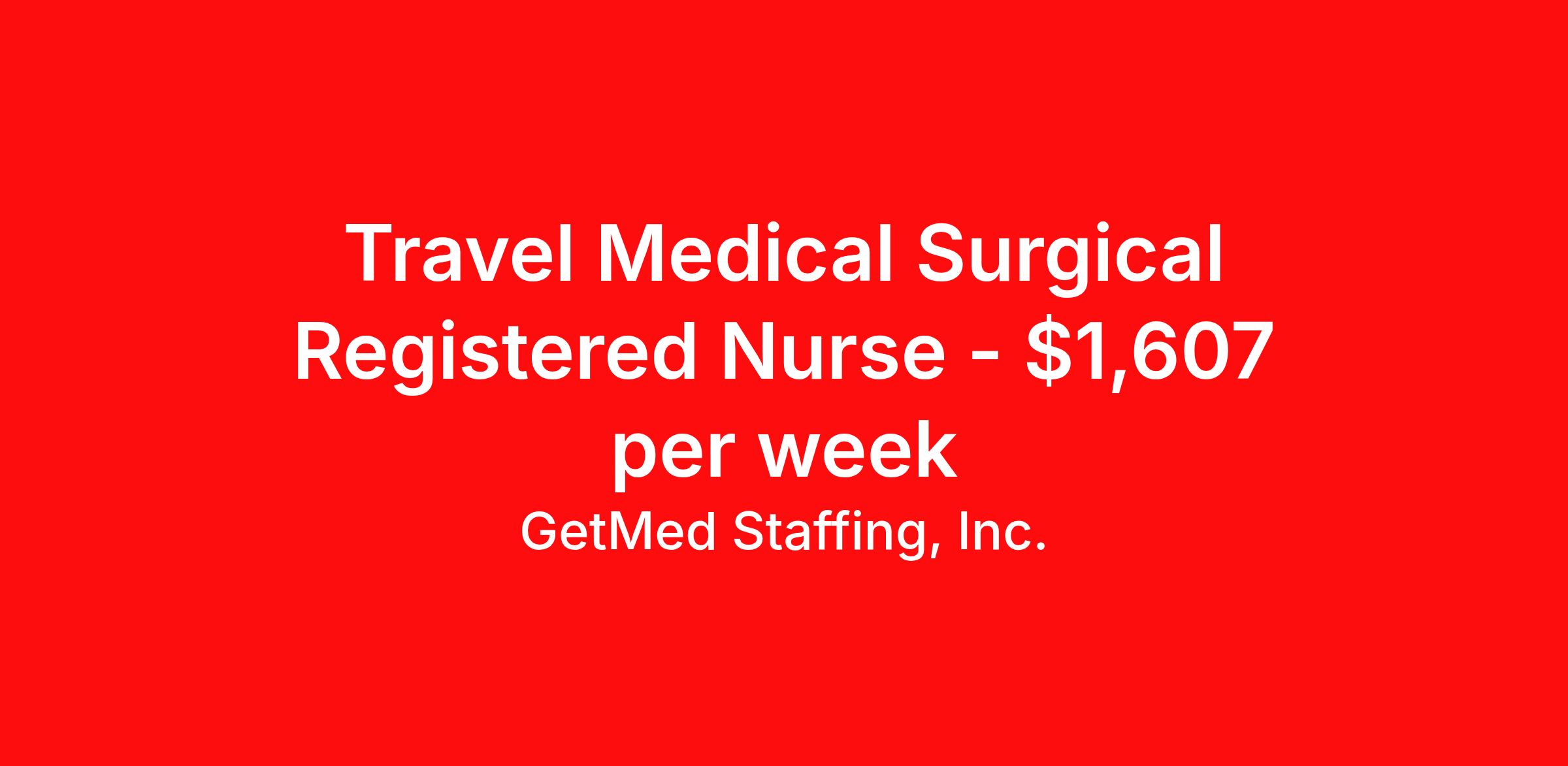 GetMed Staffing, Inc. is seeking a travel nurse RN Med Surg for a travel nursing job in Ronceverte, West Virginia. Job Description & Requirements Specialty: Med Surg Discipline: RN Start Date: 03/31/2026 Duration: 13 weeks 36 hours per week Shift: 12 hours, nights Employment Type: Travel GetMed Staffing is searching for a strong MedSurg RN to assist our traveler-friendly client. A minimum of 1-2 years of experience is required. Traveling with GetMed Staffing offers the unique opportunity to gain diverse experiences, both personally and professionally. Gain experience that matters. GetMed Staffing, Inc. Job ID 36174087. Pay package is based on 12 hour shifts and 36.0 hours per week (subject to confirmation) with tax-free stipend amount to be determined. Posted job title: RN:MedSurg,19:00:00-07:00:00 About GetMed Staffing, Inc. We are a diversity owned company, specializing in healthcare recruiting services. We truly understand how important a healthcare travelers' relationship is with their recruiter, as well as our relationship is with our healthcare facilities. We recognize that the needs of our healthcare travelers can vary, and therefore we provide the personalized touch necessary to ensure a successful travel assignment each and every time. Our healthcare facilities and clients benefit from us putting our healthcare travelers first. GetMed Staffing is excited to be a leader within the industry by focusing on providing healthcare travelers with more choices and possibilities as they plan for their next healthcare travel assignment. Benefits Life insurance Medical benefits Dental benefits Vision benefits 401k retirement plan