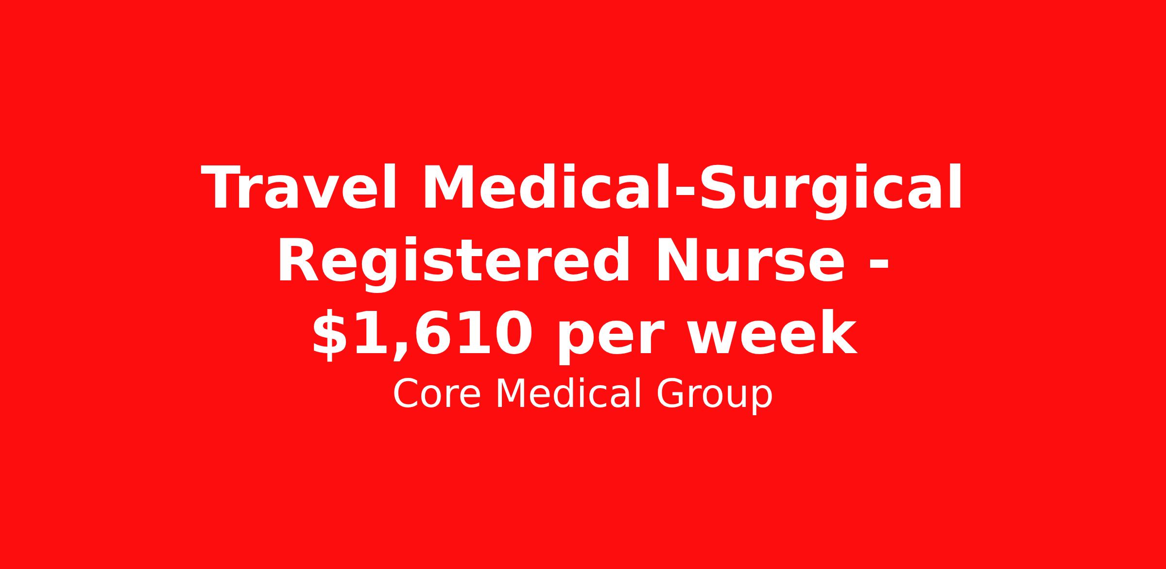Core Medical Group is seeking a travel nurse RN Med Surg for a travel nursing job in Camden, South Carolina. Job Description & Requirements Specialty: Med Surg Discipline: RN Start Date: 03/30/2026 Duration: 13 weeks 36 hours per week Shift: 12 hours Employment Type: Travel Client in SC seeking Registered Nurse: Med/Surg for the following shift(s): Nights We are looking for a healthcare professional who is ready to provide exceptional patient care in this contract/travel role. Contract/travel assignments are typically 13 weeks, with potential to extend. Help us continue our mission to connect people, improve lives, and give back to the community by joining the CoreMedical Group team. When you work with CoreMedical Group, we put you first and treat you like family, supporting you every step of the way. CoreMedical Group is one of the largest healthcare staffing agencies in the country, with travel and contract positions located across the United States. Our recruiters will help you find the perfect job, whether it's across the country or across the street. In addition to dedicated, personalized support from your recruiter, when you work with CoreMedical Group you'll receive: Access to an extensive benefits package, including day 1 health, dental, and vision insurance, employer paid life insurance, a health reimbursement account, and more! Weekly paychecks with competitive pay packages Matching 401(k) benefits to help you save for retirement Licensure assistance and reimbursement to set you up for success on your contract Travel reimbursement and dedicated housing support while on assignment Referral cash bonuses when you connect us with other clinicians CoreMedical Group also offers you a free, all-inclusive vacation each year as our way of saying "thank you" for your hard work. Join other healthcare professionals on the annual Club CoreMed retreat and you'll see why our contract and travel professionals come back to us year after year! Your career is too valuable to tackle on your own. Let CoreMedical Group help you with your healthcare journey! *Estimate of weekly payments is intended for informational purposes and includes hourly wages, as well as reimbursements for meal & incidental expenses, and housing expenses incurred on behalf of the Company. Any benefits (medical/dental/vision) are in addition to the weekly pay. Please speak with your Recruiter for additional details. Estimated payments are subject to change until formal offer of assignment is made and accepted. Core Medical Group Job ID 1364359. Pay package is based on 12 hour shifts and 36 hours per week (subject to confirmation) with tax-free stipend amount to be determined. Posted job title: RN About Core Medical Group CoreMedical Group is one of the largest healthcare staffing agencies in the country. We have jobs nationwide in travel nursing, travel allied health, interim, locum tenens, and permanent placements! Join the staffing agency with Club CoreMed, the best perk in the industry - an all inclusive paid trip to a tropical resort! Benefits Weekly pay Holiday Pay Guaranteed Hours Continuing Education 401k retirement plan Pet insurance Company provided housing options Sick pay Wellness and fitness programs Mileage reimbursement Referral bonus Employee assistance programs Medical benefits Dental benefits Vision benefits Benefits start day 1 License and certification reimbursement Life insurance Discount program