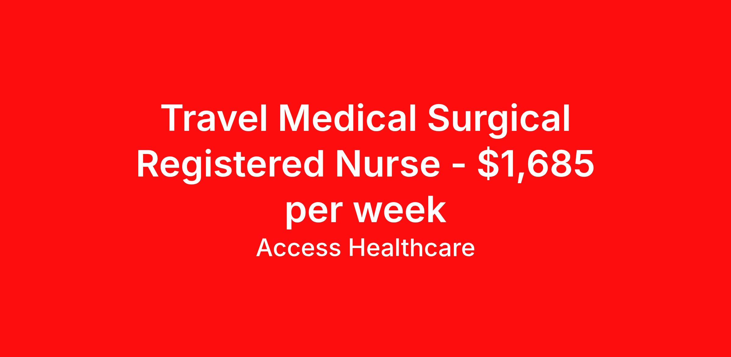 Access Healthcare is seeking a travel nurse RN Med Surg for a travel nursing job in Amarillo, Texas. Job Description & Requirements Specialty: Med Surg Discipline: RN Start Date: 04/06/2026 Duration: 13 weeks 36 hours per week Shift: 12 hours, nights Employment Type: Travel Access Healthcare Job ID 76133234. Pay package is based on 12 hour shifts and 36 hours per week (subject to confirmation) with tax-free stipend amount to be determined. About Access Healthcare Access Healthcare aims to provide superior service to our nursing family by providing around the clock support, competitive pay packages and an unmatched benefits package! Unlike other agencies, we offer a true family feel and work with you to find the placement that is right for you. We offer one of the top leading pay packages in the industry and we are ready to get you the money you deserve! Access Healthcare was founded by two travel nurses, Danielle and Diego, who had a dream and a shared vision of creating an agency which all nurses would want to work with. Our passion has led us to where we are today as one of the top 10 agencies in our home state of New Jersey, with access to contracts in all 50 states! We encourage you to join our team and we cannot wait to get to know you!