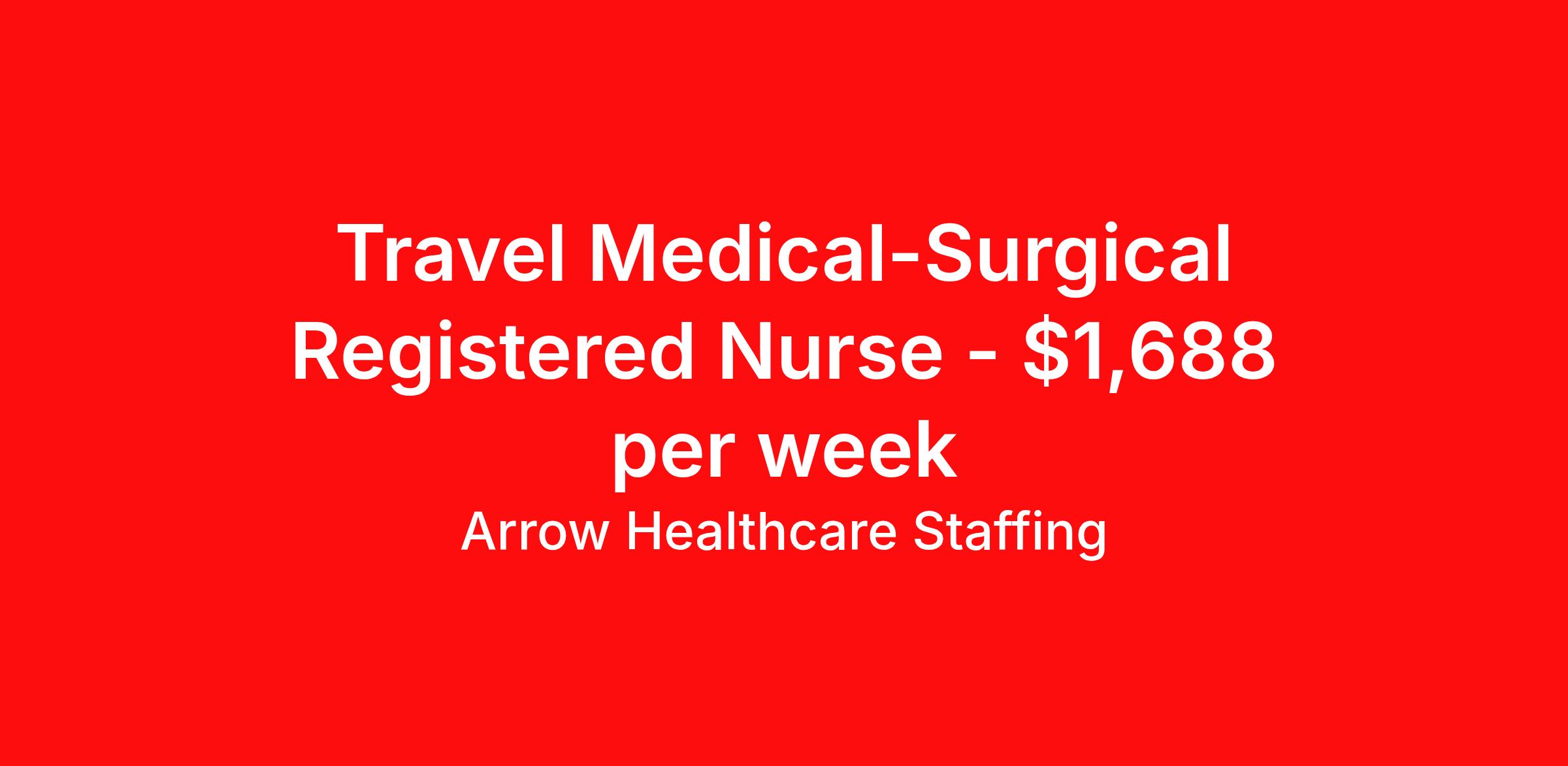 Arrow Healthcare Staffing is seeking a travel nurse RN Med Surg for a travel nursing job in Camden, South Carolina. Job Description & Requirements Specialty: Med Surg Discipline: RN Start Date: 04/13/2026 Duration: 15 weeks 36 hours per week Shift: 12 hours, nights Employment Type: Travel Arrow Healthcare Staffing Job ID 17940049. Pay package is based on 12 hour shifts and 36.0 hours per week (subject to confirmation) with tax-free stipend amount to be determined. Posted job title: RN - MedSurg RN MedSurg About Arrow Healthcare Staffing Arrow Healthcare Staffing is a Midwest based travel nursing and allied health recruiting firm. We specialize in local/ travel nursing, medical laboratory, pharmacy, radiology/imaging, therapy, and executive/leadership recruitment. We offer direct hospital contracts and all of the top benefits in the marketplace today. Benefits Medical benefits Vision benefits Weekly pay Benefits start day 1 Holiday Pay 401k retirement plan Dental benefits License and certification reimbursement Guaranteed Hours Continuing Education Cancelation protection Mileage reimbursement Referral bonus