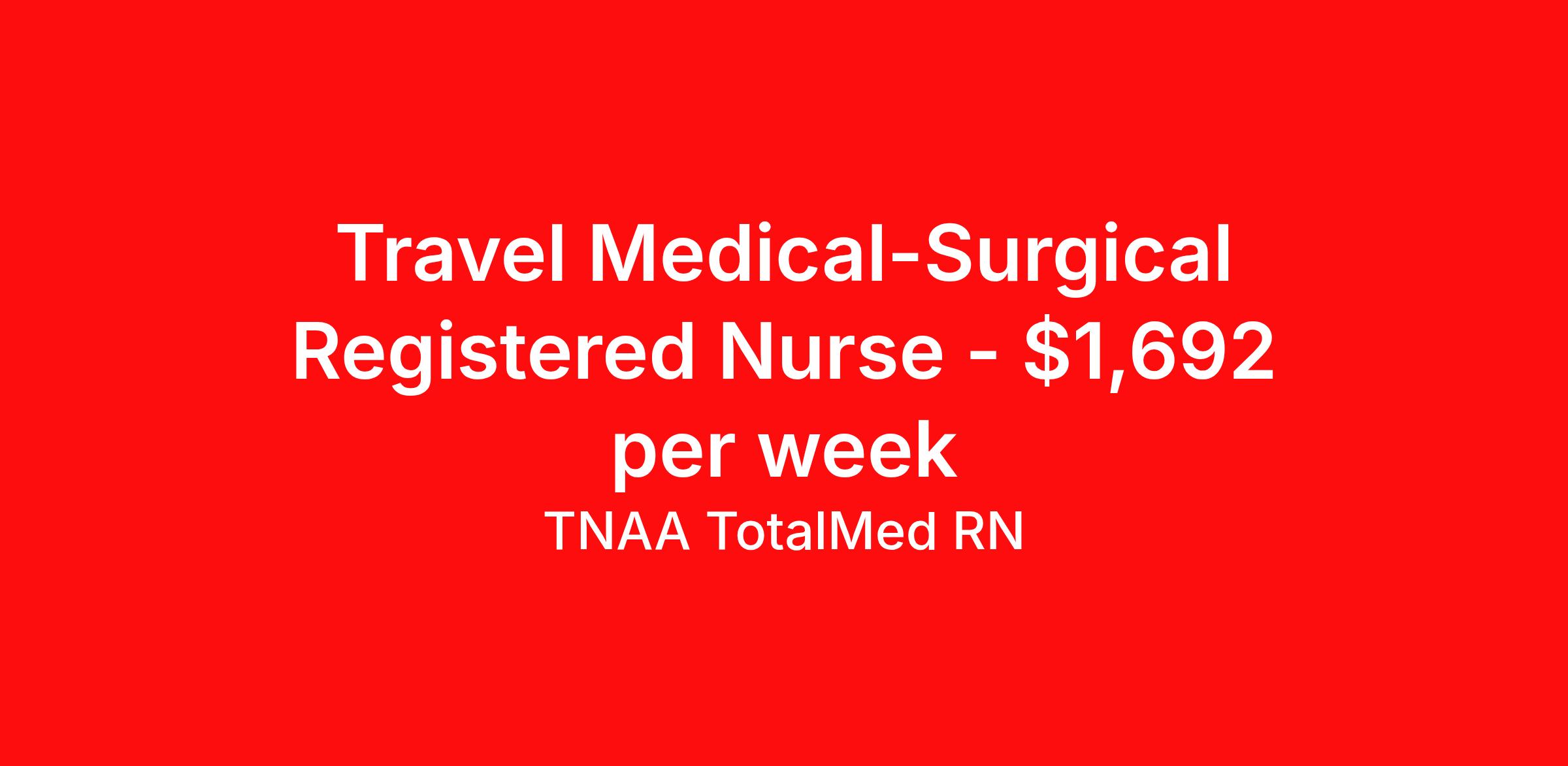 TNAA TotalMed RN is seeking a travel nurse RN Med Surg for a travel nursing job in Saint Louis, Missouri. Job Description & Requirements Specialty: Med Surg Discipline: RN Duration: 13 weeks 36 hours per week Shift: 12 hours, days Employment Type: Travel We're looking for Medical Surgical RNs for an immediate travel nurse opening in Saint Louis, MO. The right RN should have 1-2 years recent acute care experience. Read below for more requirements. As a MedSurg RN, you will conduct patient assessments and prioritize data collection based on patients' immediate conditions or needs. MedSurg RNs perform ongoing assessments and appropriate treatments as ordered by a physician. Documenting patient findings and providing education and support to patients' families is essential to this travel nurse position. As a Medical Surgical Travel Nurse, you should be prepared to perform the following tasks: Provide bedside care for a variety of patients, including pre- and post-op patients. Prepare, administer and record prescribed medication, reporting any adverse reactions to treatment. Change dressings, insert catheters and start IVs. Prepares equipment and aids physician during examination and treatment of patient. Educates patients on surgical procedures. Participates in discharge planning and initiates patient education plan as prescribed by physician. Medical Surgical Travel Nurses should be able to stand and walk for long periods of time, as well as bend, lean and stoop without difficulty. RNs should be able to easily lift 20 pounds. Moving or lifting of patients may require lifting of up to 50 pounds at times. RNs will work in a fast-paced environment treating patients that may be confused, agitated, and/or uncooperative. Requirements*: BLS, 1 Year * Additional certifications may be required before beginning an assignment. TotalMed Travel Job ID 1394603. Pay package is based on 12 hour shifts and 36 hours per week (subject to confirmation) with tax-free stipend amount to be determined. Posted job title: Medical/Surgical - MedSurg RN - Travel Nurse About TNAA TotalMed RN TotalMed is a Top Ten, travel nursing and healthcare staffing agency with the mission of igniting purpose in healthcare. The organization staffs nurses, therapists, pharmacists, and other clinicians of all specialties in all 50 states. They offer local and travel jobs and match caregivers with the right organization to assist both facilities and patients. As an organization, they focus on putting highly-skilled staff into facilities to ensure adequate staffing for a better patient experience. TotalMed specializes in recruiting and placing healthcare professionals in travel, PRN, and permanent positions across the country in Nursing and Allied Health. Throughout 2020, the organization filled roles at even the most short-staffed facilities during the most challenging time in healthcare. By matching the right travel healthcare professional with the right organization, TotalMed continues to offer a lifeline to facilities and their patients. Benefits Weekly pay Guaranteed Hours Continuing Education 401k retirement plan Sick pay Wellness and fitness programs Referral bonus Employee assistance programs Medical benefits Dental benefits Vision benefits Benefits start day 1