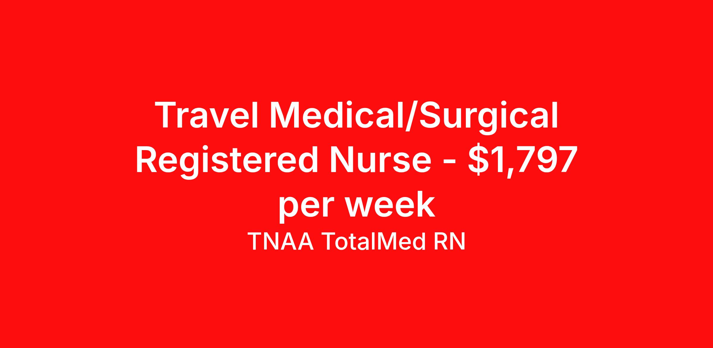 TNAA TotalMed RN is seeking a travel nurse RN Med Surg for a travel nursing job in Wichita, Kansas. Job Description & Requirements Specialty: Med Surg Discipline: RN Duration: 13 weeks 36 hours per week Shift: 12 hours, nights Employment Type: Travel We're looking for Medical Surgical RNs for an immediate travel nurse opening in Wichita, KS. The right RN should have 1-2 years recent acute care experience. Read below for more requirements. As a MedSurg RN, you will conduct patient assessments and prioritize data collection based on patients' immediate conditions or needs. MedSurg RNs perform ongoing assessments and appropriate treatments as ordered by a physician. Documenting patient findings and providing education and support to patients' families is essential to this travel nurse position. As a Medical Surgical Travel Nurse, you should be prepared to perform the following tasks: Provide bedside care for a variety of patients, including pre- and post-op patients. Prepare, administer and record prescribed medication, reporting any adverse reactions to treatment. Change dressings, insert catheters and start IVs. Prepares equipment and aids physician during examination and treatment of patient. Educates patients on surgical procedures. Participates in discharge planning and initiates patient education plan as prescribed by physician. Medical Surgical Travel Nurses should be able to stand and walk for long periods of time, as well as bend, lean and stoop without difficulty. RNs should be able to easily lift 20 pounds. Moving or lifting of patients may require lifting of up to 50 pounds at times. RNs will work in a fast-paced environment treating patients that may be confused, agitated, and/or uncooperative. Requirements*: BLS, 2 Years * Additional certifications may be required before beginning an assignment. TotalMed Travel Job ID 1391912. Pay package is based on 12 hour shifts and 36 hours per week (subject to confirmation) with tax-free stipend amount to be determined. Posted job title: Medical/Surgical - MedSurg RN - Travel Nurse About TNAA TotalMed RN TotalMed is a Top Ten, travel nursing and healthcare staffing agency with the mission of igniting purpose in healthcare. The organization staffs nurses, therapists, pharmacists, and other clinicians of all specialties in all 50 states. They offer local and travel jobs and match caregivers with the right organization to assist both facilities and patients. As an organization, they focus on putting highly-skilled staff into facilities to ensure adequate staffing for a better patient experience. TotalMed specializes in recruiting and placing healthcare professionals in travel, PRN, and permanent positions across the country in Nursing and Allied Health. Throughout 2020, the organization filled roles at even the most short-staffed facilities during the most challenging time in healthcare. By matching the right travel healthcare professional with the right organization, TotalMed continues to offer a lifeline to facilities and their patients. Benefits Weekly pay Guaranteed Hours Continuing Education 401k retirement plan Sick pay Wellness and fitness programs Referral bonus Employee assistance programs Medical benefits Dental benefits Vision benefits Benefits start day 1