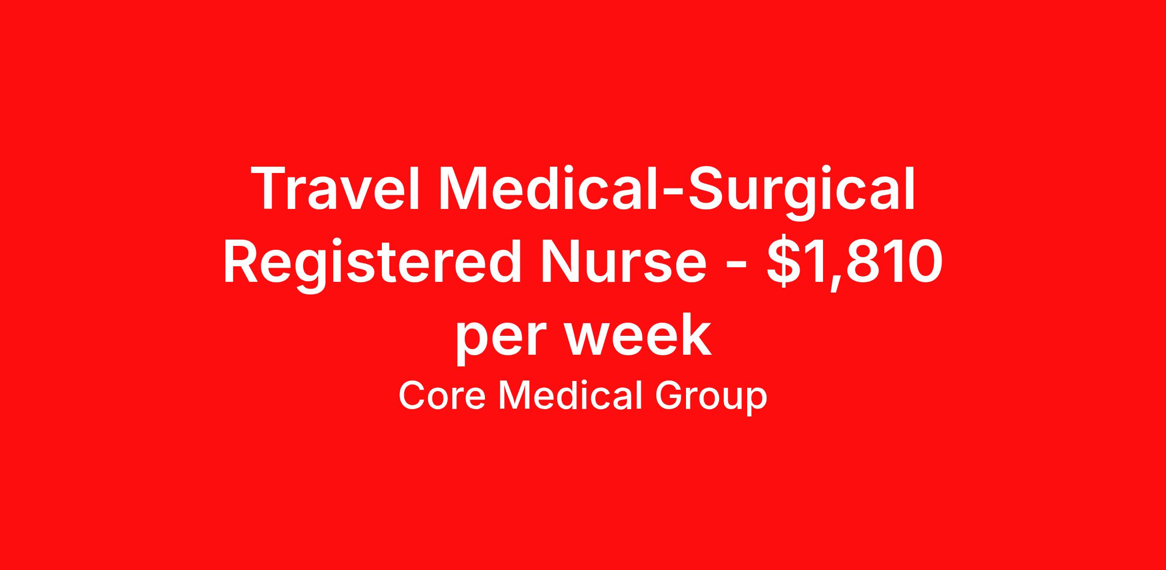 Core Medical Group is seeking a travel nurse RN Med Surg for a travel nursing job in Burlington, North Carolina. Job Description & Requirements Specialty: Med Surg Discipline: RN Start Date: 04/06/2026 Duration: 13 weeks 36 hours per week Shift: 12 hours Employment Type: Travel Client in NC seeking Registered Nurse: Med/Surg for the following shift(s): Nights We are looking for a healthcare professional who is ready to provide exceptional patient care in this contract/travel role. Contract/travel assignments are typically 13 weeks, with potential to extend. Help us continue our mission to connect people, improve lives, and give back to the community by joining the CoreMedical Group team. When you work with CoreMedical Group, we put you first and treat you like family, supporting you every step of the way. CoreMedical Group is one of the largest healthcare staffing agencies in the country, with travel and contract positions located across the United States. Our recruiters will help you find the perfect job, whether it's across the country or across the street. In addition to dedicated, personalized support from your recruiter, when you work with CoreMedical Group you'll receive: Access to an extensive benefits package, including day 1 health, dental, and vision insurance, employer paid life insurance, a health reimbursement account, and more! Weekly paychecks with competitive pay packages Matching 401(k) benefits to help you save for retirement Licensure assistance and reimbursement to set you up for success on your contract Travel reimbursement and dedicated housing support while on assignment Referral cash bonuses when you connect us with other clinicians CoreMedical Group also offers you a free, all-inclusive vacation each year as our way of saying "thank you" for your hard work. Join other healthcare professionals on the annual Club CoreMed retreat and you'll see why our contract and travel professionals come back to us year after year! Your career is too valuable to tackle on your own. Let CoreMedical Group help you with your healthcare journey! *Estimate of weekly payments is intended for informational purposes and includes hourly wages, as well as reimbursements for meal & incidental expenses, and housing expenses incurred on behalf of the Company. Any benefits (medical/dental/vision) are in addition to the weekly pay. Please speak with your Recruiter for additional details. Estimated payments are subject to change until formal offer of assignment is made and accepted. Core Medical Group Job ID 1358510. Pay package is based on 12 hour shifts and 36 hours per week (subject to confirmation) with tax-free stipend amount to be determined. Posted job title: RN About Core Medical Group CoreMedical Group is one of the largest healthcare staffing agencies in the country. We have jobs nationwide in travel nursing, travel allied health, interim, locum tenens, and permanent placements! Join the staffing agency with Club CoreMed, the best perk in the industry - an all inclusive paid trip to a tropical resort! Benefits Weekly pay Holiday Pay Guaranteed Hours Continuing Education 401k retirement plan Pet insurance Company provided housing options Sick pay Wellness and fitness programs Mileage reimbursement Referral bonus Employee assistance programs Medical benefits Dental benefits Vision benefits Benefits start day 1 License and certification reimbursement Life insurance Discount program