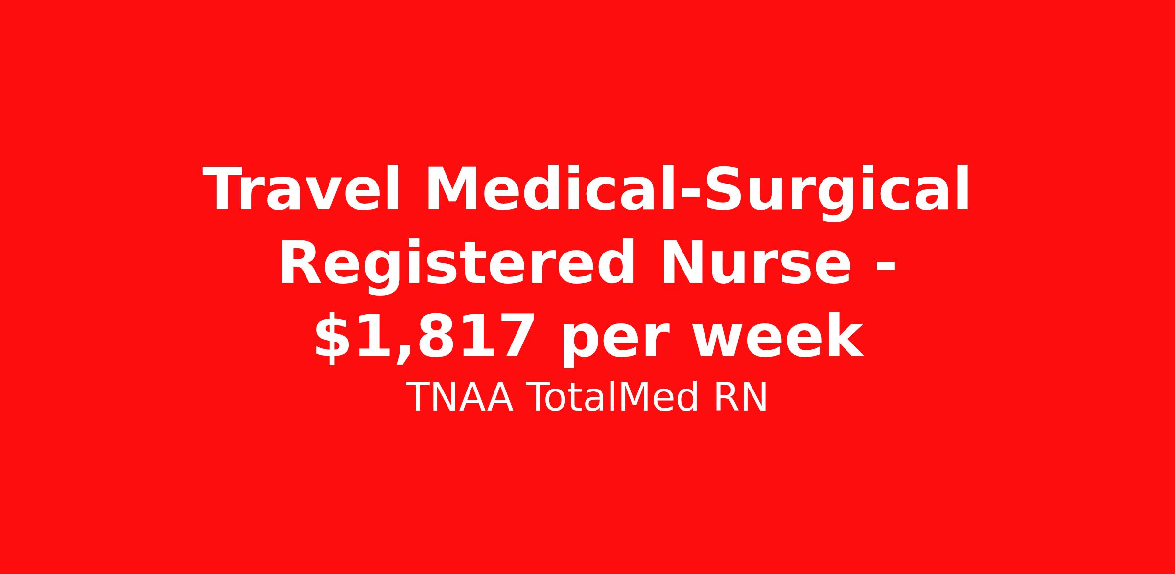 TNAA TotalMed RN is seeking a travel nurse RN Med Surg for a travel nursing job in Santa Fe, New Mexico. Job Description & Requirements Specialty: Med Surg Discipline: RN Duration: 13 weeks 36 hours per week Shift: 12 hours, nights Employment Type: Travel We're looking for Medical Surgical RNs for an immediate travel nurse opening in Santa Fe, NM. The right RN should have 1-2 years recent acute care experience. Read below for more requirements. As a MedSurg RN, you will conduct patient assessments and prioritize data collection based on patients' immediate conditions or needs. MedSurg RNs perform ongoing assessments and appropriate treatments as ordered by a physician. Documenting patient findings and providing education and support to patients' families is essential to this travel nurse position. As a Medical Surgical Travel Nurse, you should be prepared to perform the following tasks: Provide bedside care for a variety of patients, including pre- and post-op patients. Prepare, administer and record prescribed medication, reporting any adverse reactions to treatment. Change dressings, insert catheters and start IVs. Prepares equipment and aids physician during examination and treatment of patient. Educates patients on surgical procedures. Participates in discharge planning and initiates patient education plan as prescribed by physician. Medical Surgical Travel Nurses should be able to stand and walk for long periods of time, as well as bend, lean and stoop without difficulty. RNs should be able to easily lift 20 pounds. Moving or lifting of patients may require lifting of up to 50 pounds at times. RNs will work in a fast-paced environment treating patients that may be confused, agitated, and/or uncooperative. Requirements*: BLS, 2 Years * Additional certifications may be required before beginning an assignment. TotalMed Travel Job ID 1389974. Pay package is based on 12 hour shifts and 36 hours per week (subject to confirmation) with tax-free stipend amount to be determined. Posted job title: Medical/Surgical - MedSurg RN - Travel Nurse About TNAA TotalMed RN TotalMed is a Top Ten, travel nursing and healthcare staffing agency with the mission of igniting purpose in healthcare. The organization staffs nurses, therapists, pharmacists, and other clinicians of all specialties in all 50 states. They offer local and travel jobs and match caregivers with the right organization to assist both facilities and patients. As an organization, they focus on putting highly-skilled staff into facilities to ensure adequate staffing for a better patient experience. TotalMed specializes in recruiting and placing healthcare professionals in travel, PRN, and permanent positions across the country in Nursing and Allied Health. Throughout 2020, the organization filled roles at even the most short-staffed facilities during the most challenging time in healthcare. By matching the right travel healthcare professional with the right organization, TotalMed continues to offer a lifeline to facilities and their patients. Benefits Weekly pay Guaranteed Hours Continuing Education 401k retirement plan Sick pay Wellness and fitness programs Referral bonus Employee assistance programs Medical benefits Dental benefits Vision benefits Benefits start day 1