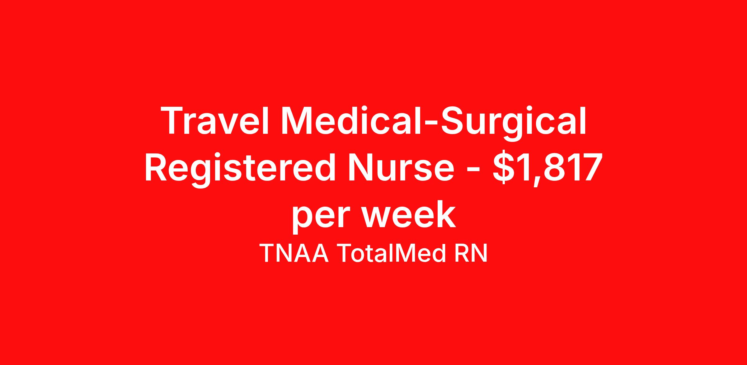 TNAA TotalMed RN is seeking a travel nurse RN Med Surg for a travel nursing job in Santa Fe, New Mexico. Job Description & Requirements Specialty: Med Surg Discipline: RN Duration: 13 weeks 36 hours per week Shift: 12 hours, nights Employment Type: Travel We're looking for Medical Surgical RNs for an immediate travel nurse opening in Santa Fe, NM. The right RN should have 1-2 years recent acute care experience. Read below for more requirements. As a MedSurg RN, you will conduct patient assessments and prioritize data collection based on patients' immediate conditions or needs. MedSurg RNs perform ongoing assessments and appropriate treatments as ordered by a physician. Documenting patient findings and providing education and support to patients' families is essential to this travel nurse position. As a Medical Surgical Travel Nurse, you should be prepared to perform the following tasks: Provide bedside care for a variety of patients, including pre- and post-op patients. Prepare, administer and record prescribed medication, reporting any adverse reactions to treatment. Change dressings, insert catheters and start IVs. Prepares equipment and aids physician during examination and treatment of patient. Educates patients on surgical procedures. Participates in discharge planning and initiates patient education plan as prescribed by physician. Medical Surgical Travel Nurses should be able to stand and walk for long periods of time, as well as bend, lean and stoop without difficulty. RNs should be able to easily lift 20 pounds. Moving or lifting of patients may require lifting of up to 50 pounds at times. RNs will work in a fast-paced environment treating patients that may be confused, agitated, and/or uncooperative. Requirements*: BLS, 2 Years * Additional certifications may be required before beginning an assignment. TotalMed Travel Job ID 1389974. Pay package is based on 12 hour shifts and 36 hours per week (subject to confirmation) with tax-free stipend amount to be determined. Posted job title: Medical/Surgical - MedSurg RN - Travel Nurse About TNAA TotalMed RN TotalMed is a Top Ten, travel nursing and healthcare staffing agency with the mission of igniting purpose in healthcare. The organization staffs nurses, therapists, pharmacists, and other clinicians of all specialties in all 50 states. They offer local and travel jobs and match caregivers with the right organization to assist both facilities and patients. As an organization, they focus on putting highly-skilled staff into facilities to ensure adequate staffing for a better patient experience. TotalMed specializes in recruiting and placing healthcare professionals in travel, PRN, and permanent positions across the country in Nursing and Allied Health. Throughout 2020, the organization filled roles at even the most short-staffed facilities during the most challenging time in healthcare. By matching the right travel healthcare professional with the right organization, TotalMed continues to offer a lifeline to facilities and their patients. Benefits Weekly pay Guaranteed Hours Continuing Education 401k retirement plan Sick pay Wellness and fitness programs Referral bonus Employee assistance programs Medical benefits Dental benefits Vision benefits Benefits start day 1