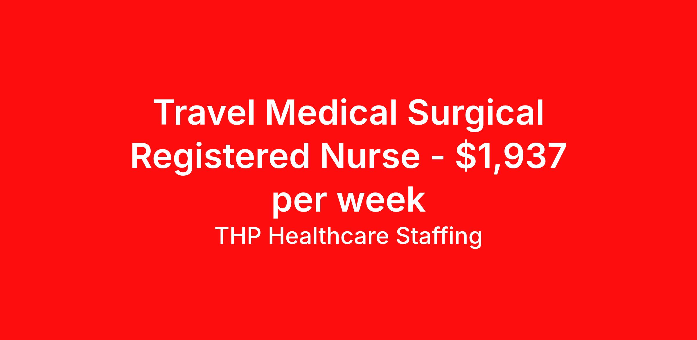 THP Healthcare Staffing is seeking a travel nurse RN Med Surg for a travel nursing job in Ronceverte, West Virginia. Job Description & Requirements Specialty: Med Surg Discipline: RN Start Date: 03/31/2026 Duration: 13 weeks 36 hours per week Shift: 12 hours, nights Employment Type: Travel Our Client is currently seeking RN - MedSurg positions in Ronceverte, WV for a 3x12 Nights shift. You must have current State Licensure and at least 1 year of recent experience. Requirements Current Resume State Licensure Current BLS and/or ACLS and/or Specialty Certifications 2 Current Clinical References Physical (Within 12 Months) TB Skin Test (Within 12 Months) Titers - MMR/Hep B/Varicella Respiratory Fit Test (Within 12 Months) Current - Tdap/Flu Vaccinations Must be able to pass pre-employment, background and urine drug screening Compensation and Benefits Compettive Pay Packages Health Benefit Package Travel pay - 1st pay check Extending Contract Bonus Refer a friend and earn extra cash! At THP Healthcare Staffing, we take care of you - work with us, not for us! THP Healthcare Staffing Job ID 17979368. Pay package is based on 12 hour shifts and 36.0 hours per week (subject to confirmation) with tax-free stipend amount to be determined. Posted job title: RN:MedSurg,19:00:00-07:00:00 About THP Healthcare Staffing At THP Staffing, we specialize in connecting healthcare facilities with highly skilled travel nurses and allied health professionals who bring exceptional care and expertise wherever they go. Our mission is to ensure that every healthcare provider has access to top nursing talent, regardless of location, to deliver superior patient outcomes. Benefits Weekly pay Life insurance Pet insurance License and certification reimbursement Medical benefits Employee assistance programs Referral bonus Vision benefits Holiday Pay Health savings account