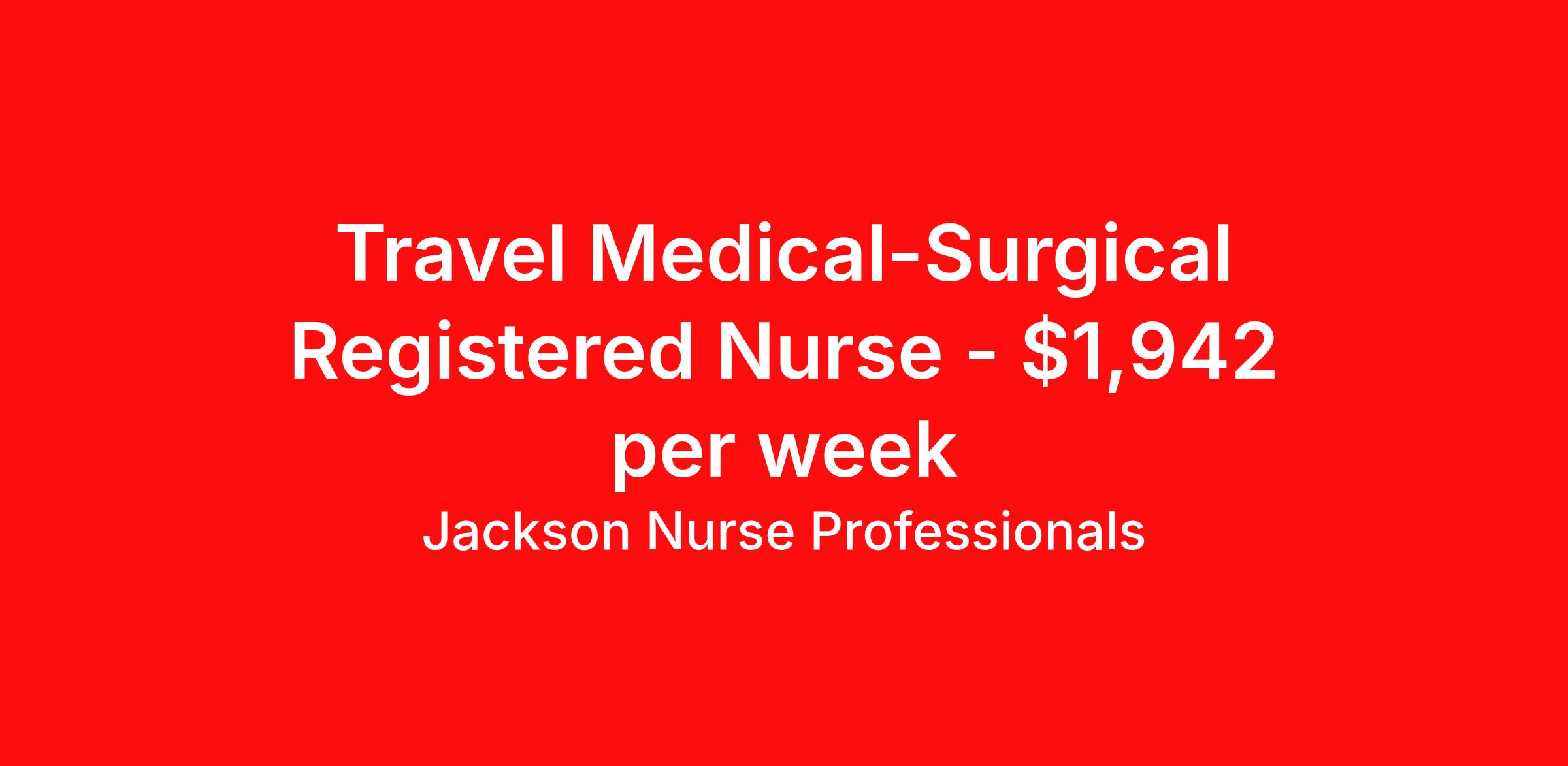Jackson Nurse Professionals is seeking a travel nurse RN Med Surg for a travel nursing job in Burlington, North Carolina. Job Description & Requirements Specialty: Med Surg Discipline: RN Start Date: 04/06/2026 Duration: 13 weeks 36 hours per week Shift: 12 hours, nights Employment Type: Travel At Jackson Nurse Professionals , we are dedicated to supporting travel nurses and helping you build a fulfilling nursing career. Whether you’re looking for your first or next travel nursing assignment, we specialize in connecting healthcare professionals with leading medical facilities. With a focus on personalized service and a wide range of opportunities, we make it easier than ever for nurses to find the right balance of adventure and professional growth. Qualifications: 2 years of recent experience in area of specialty listed on job Current BLS required (certifications vary by location – job may require ACLS) Valid license and/or certification in state of practice Valid Driver's License Background and drug screen Benefits: Full Medical, Dental and Vision Insurance 401(k) with Employer Match 24/7/365 Support from your Recruiter available by text, phone, or email Referral Bonus Program: Give $200, Get $500 for every referral Same Day Immediate Pay Access Certification & Licensure Reimbursement Apply today to experience the Jackson Nurse Professionals difference! Jackson Nurse Professionals Job ID 2455046. Pay package is based on 12 hour shifts and 36 hours per week (subject to confirmation) with tax-free stipend amount to be determined. About Jackson Nurse Professionals Filling critical needs in patient care, Jackson Nurse Professionals delivers cost-effective travel nurse staffing solutions to over 500 hospitals, outpatient clinics, and home health clients nationwide. Awarded Best of Staffing - Talent and Client 2024, and rated as a Top Workplace 2023 by the Orlando Sentinel, Jackson Nurse Professionals goes the extra mile to provide travel nurses the career they deserve, while providing clients with a large range of highly skilled nurses to fill short, long-term, and temporary assignments. As a member of Jackson Healthcare’s family of award-winning staffing companies, we’re part of a growing community that’s impacting 10 million patients nationwide. Join our mission to improve the delivery of patient care, and the lives of everyone we touch.