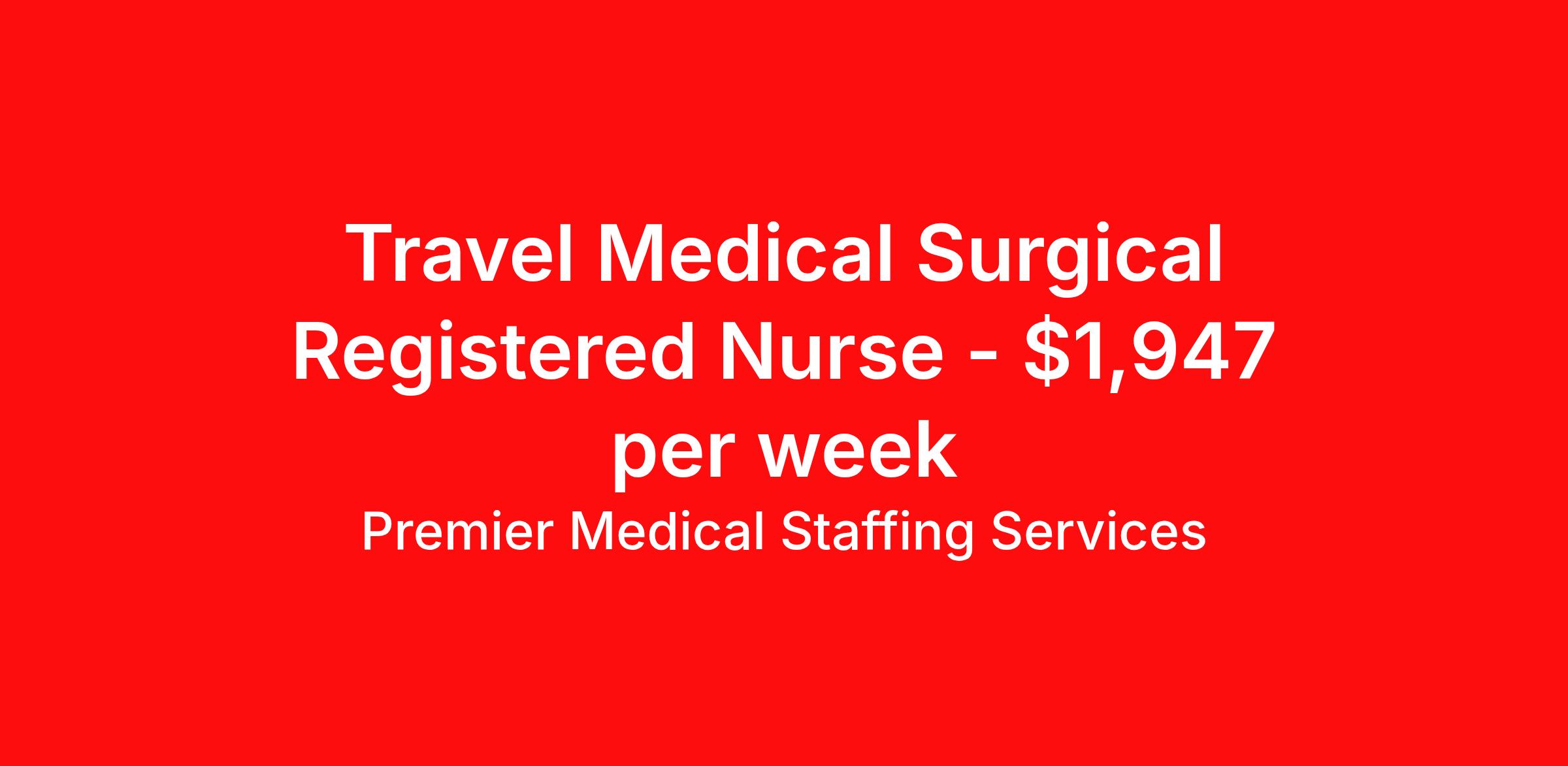 Premier Medical Staffing Services is seeking a travel nurse RN Med Surg for a travel nursing job in Kerrville, Texas. Job Description & Requirements Specialty: Med Surg Discipline: RN Start Date: 04/06/2026 Duration: 13 weeks 36 hours per week Shift: 12 hours Employment Type: Travel Premier Medical Staffing Job ID 625113. Pay package is based on 12 hour shifts and 36 hours per week (subject to confirmation) with tax-free stipend amount to be determined. Posted job title: RN Med/Surg About Premier Medical Staffing Services Premier Medical Staffing Services, LLC is a nationally expanding healthcare staffing firm for healthcare professionals and companies. We understand our clients’ need for highly qualified, expertly trained medical professionals and are passionate about helping clinicians find employment opportunities that fit their personality and needs. Able to accommodate the ever-changing needs of the healthcare landscape, we offer per-diem, contract and direct hire placements to support the unique needs of each industry sector. Premier Medical Staffing Services is Joint Commission Certified, a Military Spouse Employment Partner and is certified as a Women’s Business Enterprise. We are proudly nurse owned.