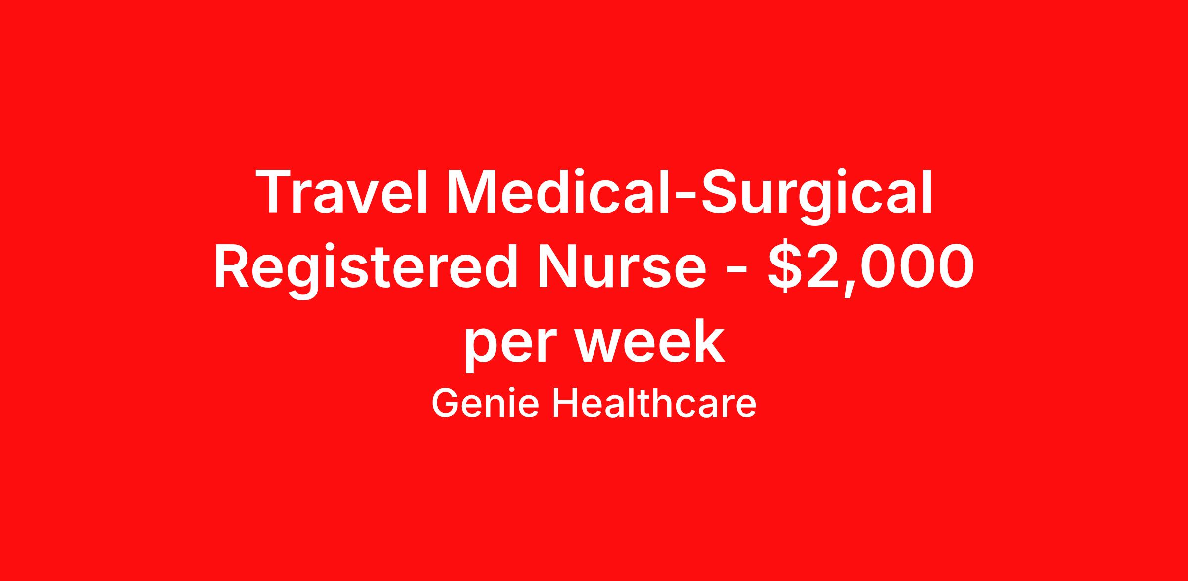 Genie Healthcare is seeking a travel nurse RN Med Surg for a travel nursing job in Burlington, North Carolina. Job Description & Requirements Specialty: Med Surg Discipline: RN Start Date: 04/06/2026 Duration: 13 weeks 36 hours per week Shift: 12 hours, nights Employment Type: Travel Genie Healthcare is looking for a RN to work in MedSurg for a 13 weeks travel assignment located in Burlington, NC for the Shift (3x12 nights, 19:00:00-07:00:00, 12.00-3). Pay and benefits packages are estimated based on client bill rate at time the job was posted. These rates are subject to change. Exact pay and benefits vary based on several things, including, but not limited to, guaranteed hours, client changes in bill rate, experience, etc. Benefits: Medical Insurance, Dental Insurance, Vision Insurance, 401(k) with company matching (50% up to 6% of what you contribute) Genie Healthcare Job ID 17981294. Pay package is based on 12 hour shifts and 36.0 hours per week (subject to confirmation) with tax-free stipend amount to be determined. Posted job title: RN:MedSurg,19:00:00-07:00:00 About Genie Healthcare Genie Healthcare is one of the fastest growing Nurse Travel Agencies in the USA. Genie serves hundreds of facilities and has over 4000 current travel RN contracts open at any given time. Genie provides travel RN’s flexibility, support, top pay scale, housing and the 1 rated, multi-state health insurance coverage. Genie Healthcare carries with it a commitment to providing a comprehensive level of service and quality care. Growing from a small team of eager recruiters to a company with satisfied clients in nearly every corner of the nation, delivering excellence in patient and customer care is the key to Genie’s success. The management team has 20 years of experience in workforce solutions and staffing in medical and non-medical fields, roles ranging from Clerical job to Cardiologist to software developer to CEO.