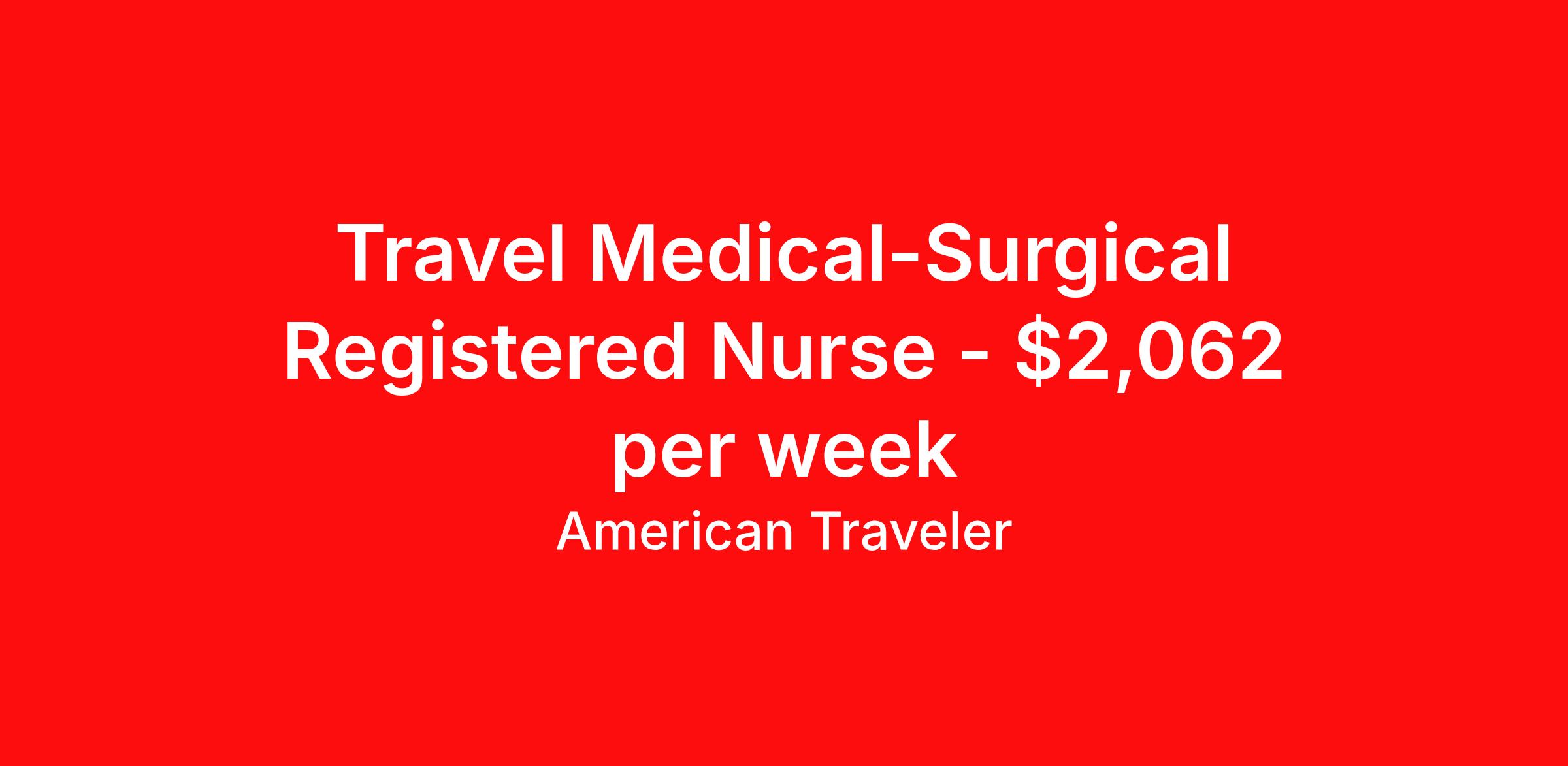 American Traveler is seeking a travel nurse RN Med Surg for a travel nursing job in Carlsbad, New Mexico. Job Description & Requirements Specialty: Med Surg Discipline: RN Start Date: 04/13/2026 Duration: 13 weeks 36 hours per week Shift: 12 hours, nights Employment Type: Travel Assignment Overview Shift: Nights, 3x12hrs Hours: 36 hrs/wk Start Date: Apr 13, 2026 Length: 13 weeks Openings: 1 Description American Traveler is seeking a travel RN for a Med/Surg night shift position in Carlsbad, NM, requiring at least 1 year of recent Med/Surg experience and a NM or Compact RN license. Details Med/Surg and Rehab unit in a hospital setting Night shift hours: 6:30 PM – 7:00 AM 13-week contract Requirements Active NM or Compact RN license required Minimum 1 year of recent Med/Surg RN experience required All certifications must remain valid through at least the first 30 days of the assignment Valid US driver's license required for consideration US Social Security Number required — Canadian SINs are not accepted Additional Information Candidates must reside more than 50 miles from the facility — local travelers are not eligible Candidates who have worked as permanent staff at any CHS facility within the past 2 years are not eligible No gaps in work history of 90 days or more within the past 12 months RTO requests must be less than one week in duration American Traveler Job ID P-685713. Pay package is based on 12 hour shifts and 36 hours per week (subject to confirmation) with tax-free stipend amount to be determined. Posted job title: Travel RN - Med/Surg About American Traveler With over 25 years of experience, American Traveler has established a reputation for outstanding customer service. Our team ensures a smooth, worry-free experience for those starting on or expanding their travel nursing and allied careers. With thousands of travel nursing and allied jobs nationwide, our attentive and approachable recruiters find positions that align perfectly with your career aspirations and personal requirements. American Traveler offers exceptional benefits, including premium medical, dental, vision and life insurance beginning day one of your assignment, generous 401(k) match, substantial housing stipends, and more. Additionally, with 24/7 support and access to our in-house clinicians, you are assured confidence and comfort throughout your assignment. With our team behind you, you can relax and enjoy a rewarding travel career.