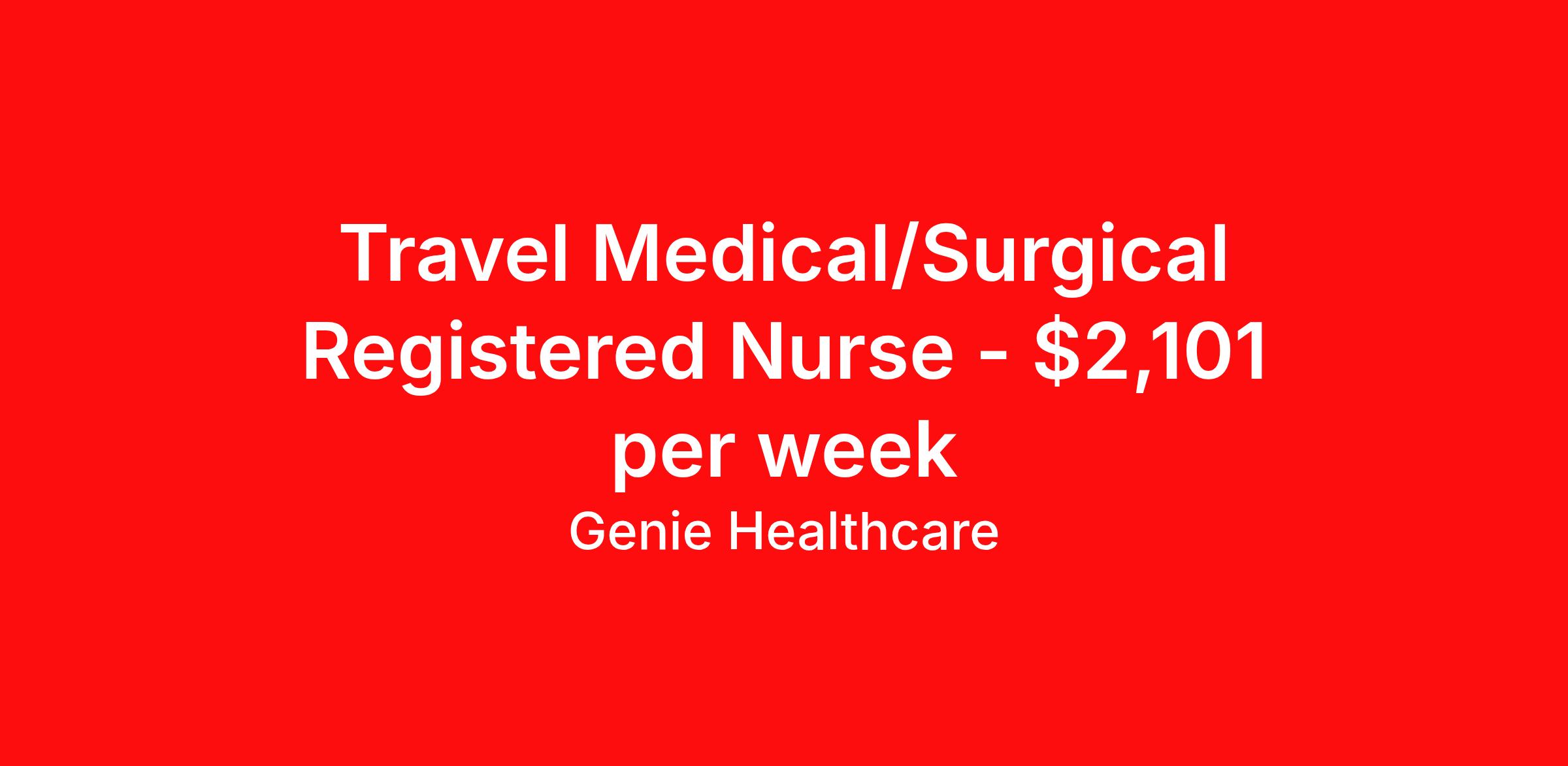 Genie Healthcare is seeking a travel nurse RN Med Surg for a travel nursing job in Aiken, South Carolina. Job Description & Requirements Specialty: Med Surg Discipline: RN Start Date: 04/13/2026 Duration: 13 weeks 36 hours per week Shift: 12 hours, nights Employment Type: Travel Genie Healthcare is looking for a RN to work in MedSurg for a 12.71 weeks travel assignment located in Aiken, SC for the Shift (3x12 nights, 19:00:00-07:00:00, 12.00-3). Pay and benefits packages are estimated based on client bill rate at time the job was posted. These rates are subject to change. Exact pay and benefits vary based on several things, including, but not limited to, guaranteed hours, client changes in bill rate, experience, etc. Benefits: Medical Insurance, Dental Insurance, Vision Insurance, 401(k) with company matching (50% up to 6% of what you contribute) Genie Healthcare Job ID 17870736. Pay package is based on 12 hour shifts and 36.0 hours per week (subject to confirmation) with tax-free stipend amount to be determined. Posted job title: RN:MedSurg,19:00:00-07:00:00 About Genie Healthcare Genie Healthcare is one of the fastest growing Nurse Travel Agencies in the USA. Genie serves hundreds of facilities and has over 4000 current travel RN contracts open at any given time. Genie provides travel RN’s flexibility, support, top pay scale, housing and the 1 rated, multi-state health insurance coverage. Genie Healthcare carries with it a commitment to providing a comprehensive level of service and quality care. Growing from a small team of eager recruiters to a company with satisfied clients in nearly every corner of the nation, delivering excellence in patient and customer care is the key to Genie’s success. The management team has 20 years of experience in workforce solutions and staffing in medical and non-medical fields, roles ranging from Clerical job to Cardiologist to software developer to CEO.