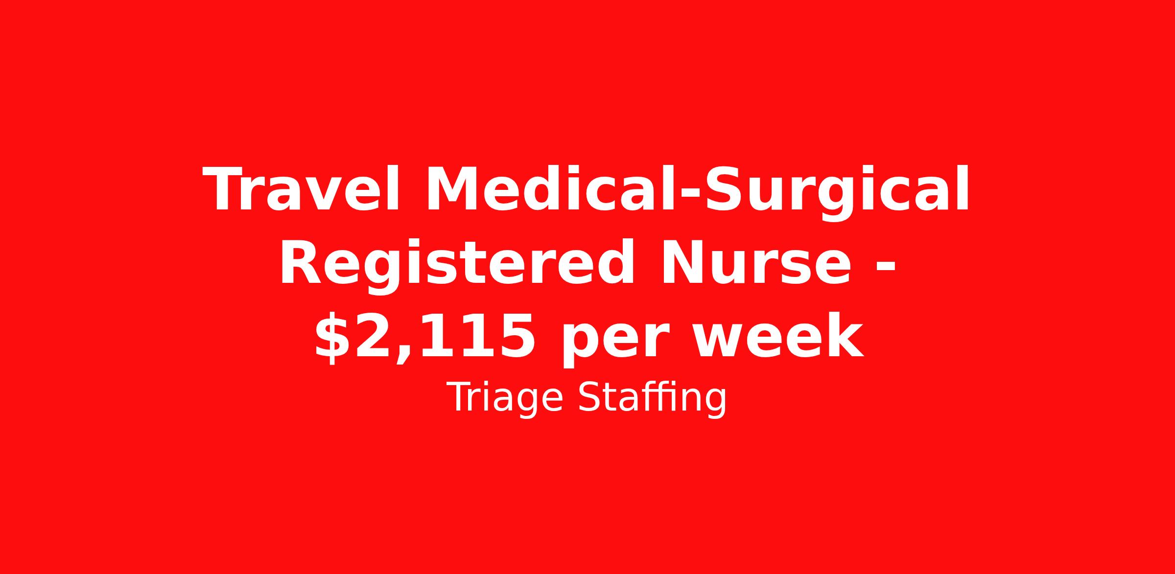 Triage Staffing is seeking a travel nurse RN Med Surg for a travel nursing job in Weirton, West Virginia. Job Description & Requirements Specialty: Med Surg Discipline: RN Start Date: ASAP Duration: 13 weeks 36 hours per week Shift: 12 hours, nights Employment Type: Travel Travel Nursing: Med/Surg Weirton, WV Location: Weirton, WV Start Date: 3/20/2026 Shift Details: 12H Nights 36 hours per week Length: 13 WEEKS Apply for specific facility details.Med Surg RN Triage Staffing Job ID AV3HLLNQ. Posted job title: Nursing: Med/Surg About Triage Staffing At Triage, we prefer to be real . Real about expectations—both ours and yours. Real about how a decision you make today could affect your tomorrows. Real about how compensation actually works. Real about how great—or grating—your next supervisor may be. Being real allows everyone at Triage to be ready . Ready to serve you with real honesty. So if that gig near the ocean is really no day at the beach, or that third shift comes with a second-class rate, we tell you. So you can be ready, too. We staff all five major divisions of acute care—nursing, lab, radiology, cardiopulmonary and rehab therapy, offering: - Competitive, custom pay packages - One point of contact for both travelers and facilities (per division) - A reliable recruiter who's got your back throughout your entire assignment - In-house compliance and accounting specialists - A clinical liaison team available 24/7 to offer medical and professional support and career development - A mentoring program that is run and managed by actual clinicians—yeah, you read that right - And more (because of course there’s more) Are we the biggest? No. Are we the best? That’s rather subjective, but we’re trying to be. Will we work like hell to get you as close to your idea of heaven as possible? Yes. Yes, we will. Benefits: Day One comprehensive, nationwide insurance plans for health, vision and dental and life—including a HSA option Day One 401(k) program with employer-matching contributions once eligible Facility cancelling protection—your time is money on and off-the-clock Guaranteed hours Weekly paychecks via direct deposit Earned vacation bonuses for time worked Paid holidays Employee assistance program (EAP)—your mental health is important, too Continuing education, certification and licensing reimbursement Workers comp—because accidents happen Top-rated professional liability insurance Company provided housing options Referral bonus—$750 in your pocket after they’ve completed a 13-week assignment