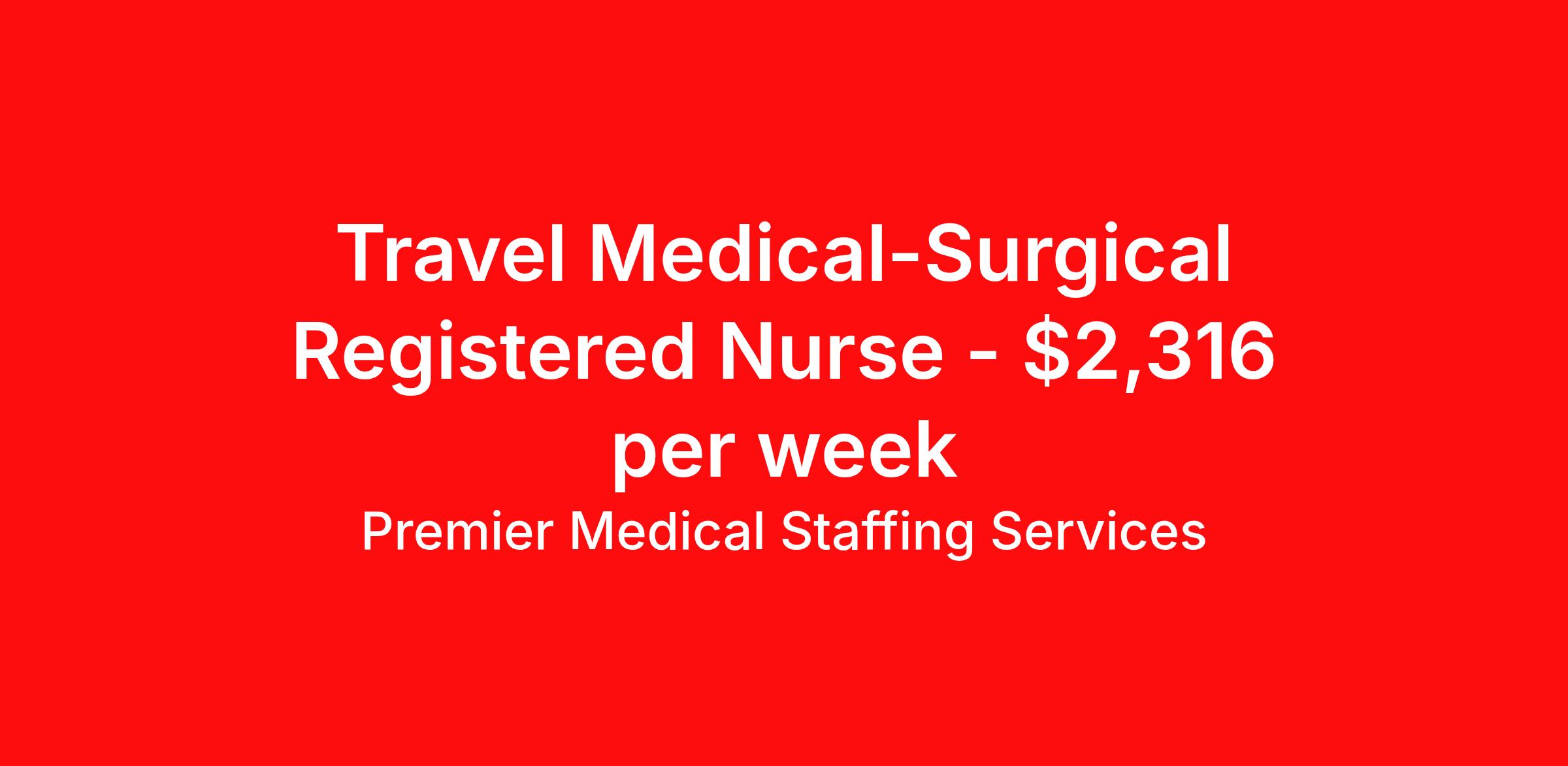 Premier Medical Staffing Services is seeking a travel nurse RN Med Surg for a travel nursing job in Iron River, Michigan. Job Description & Requirements Specialty: Med Surg Discipline: RN Start Date: 03/30/2026 Duration: 12 weeks 36 hours per week Shift: 12 hours Employment Type: Travel Premier Medical Staffing Job ID 617569. Pay package is based on 12 hour shifts and 36 hours per week (subject to confirmation) with tax-free stipend amount to be determined. Posted job title: RN Med/Surg About Premier Medical Staffing Services Premier Medical Staffing Services, LLC is a nationally expanding healthcare staffing firm for healthcare professionals and companies. We understand our clients’ need for highly qualified, expertly trained medical professionals and are passionate about helping clinicians find employment opportunities that fit their personality and needs. Able to accommodate the ever-changing needs of the healthcare landscape, we offer per-diem, contract and direct hire placements to support the unique needs of each industry sector. Premier Medical Staffing Services is Joint Commission Certified, a Military Spouse Employment Partner and is certified as a Women’s Business Enterprise. We are proudly nurse owned.