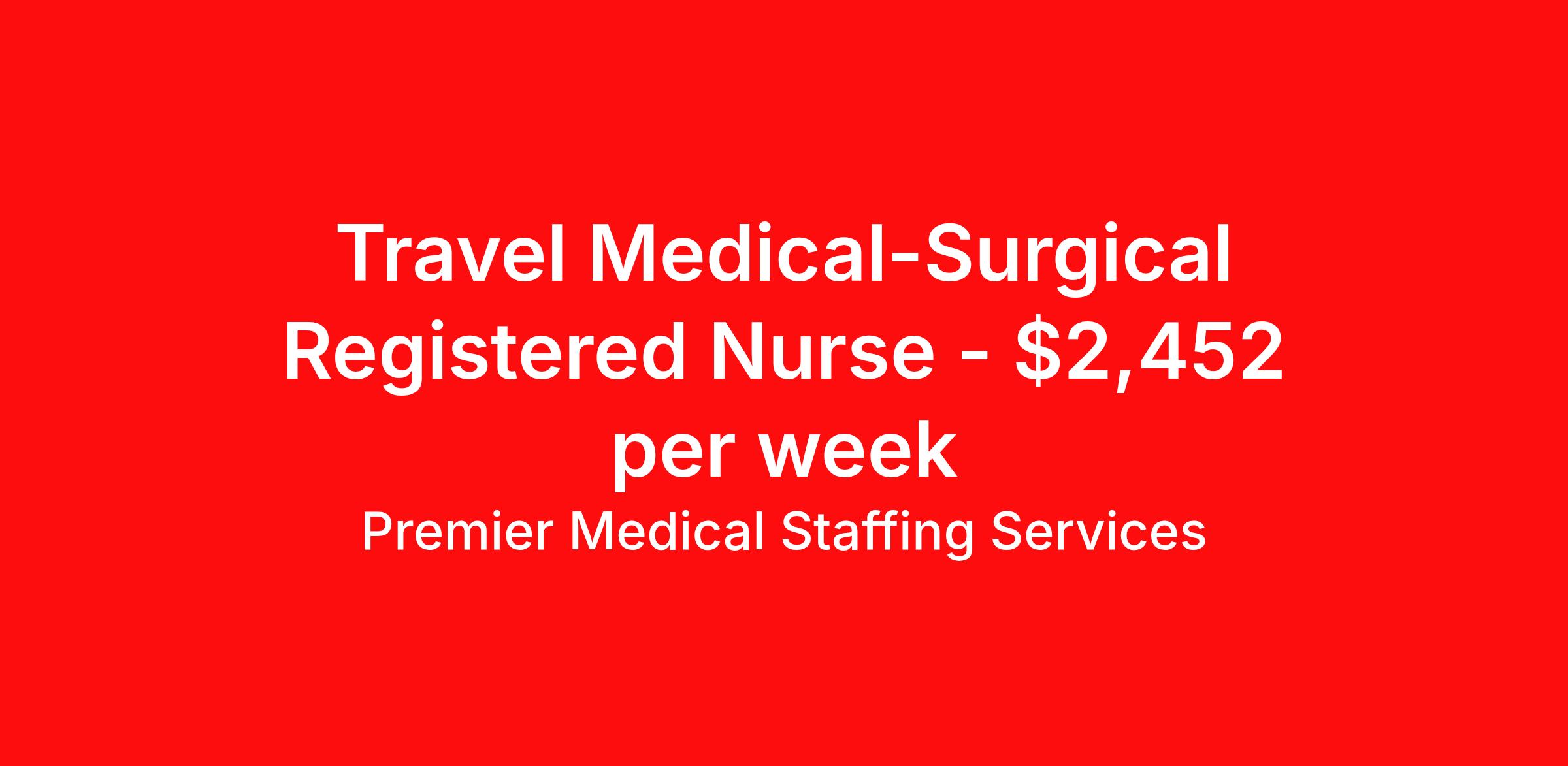 Premier Medical Staffing Services is seeking a travel nurse RN Med Surg for a travel nursing job in Hermiston, Oregon. Job Description & Requirements Specialty: Med Surg Discipline: RN Start Date: ASAP Duration: 13 weeks 36 hours per week Shift: 12 hours Employment Type: Travel Premier Medical Staffing Job ID 625772. Pay package is based on 12 hour shifts and 36 hours per week (subject to confirmation) with tax-free stipend amount to be determined. Posted job title: RN Med/Surg About Premier Medical Staffing Services Premier Medical Staffing Services, LLC is a nationally expanding healthcare staffing firm for healthcare professionals and companies. We understand our clients’ need for highly qualified, expertly trained medical professionals and are passionate about helping clinicians find employment opportunities that fit their personality and needs. Able to accommodate the ever-changing needs of the healthcare landscape, we offer per-diem, contract and direct hire placements to support the unique needs of each industry sector. Premier Medical Staffing Services is Joint Commission Certified, a Military Spouse Employment Partner and is certified as a Women’s Business Enterprise. We are proudly nurse owned.