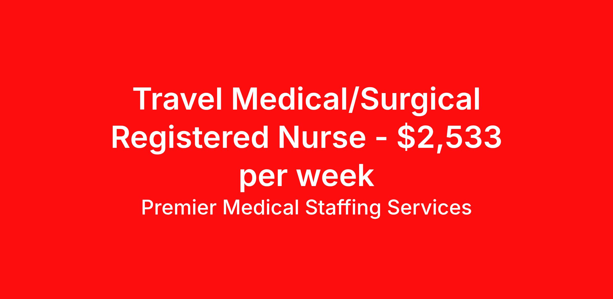 Premier Medical Staffing Services is seeking a travel nurse RN Med Surg for a travel nursing job in Marquette, Michigan. Job Description & Requirements Specialty: Med Surg Discipline: RN Start Date: 03/22/2026 Duration: 13 weeks 36 hours per week Shift: 12 hours Employment Type: Travel Premier Medical Staffing Job ID 626679. Pay package is based on 12 hour shifts and 36 hours per week (subject to confirmation) with tax-free stipend amount to be determined. Posted job title: RN Med/Surg About Premier Medical Staffing Services Premier Medical Staffing Services, LLC is a nationally expanding healthcare staffing firm for healthcare professionals and companies. We understand our clients’ need for highly qualified, expertly trained medical professionals and are passionate about helping clinicians find employment opportunities that fit their personality and needs. Able to accommodate the ever-changing needs of the healthcare landscape, we offer per-diem, contract and direct hire placements to support the unique needs of each industry sector. Premier Medical Staffing Services is Joint Commission Certified, a Military Spouse Employment Partner and is certified as a Women’s Business Enterprise. We are proudly nurse owned.